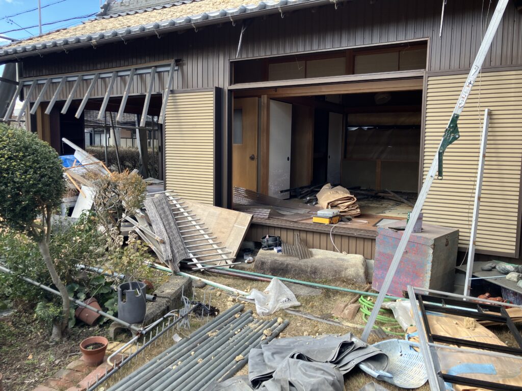 昨日から解体工事が始まりました。北東角の車庫を壊し車を入れて、離れを解体しています。風があると、瓦の下にあった土が風でいろんなところに飛散するので悲惨な事になりますが、今日は風が無く作業しやすく良かったです。