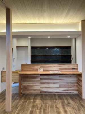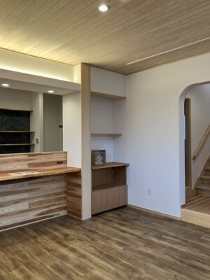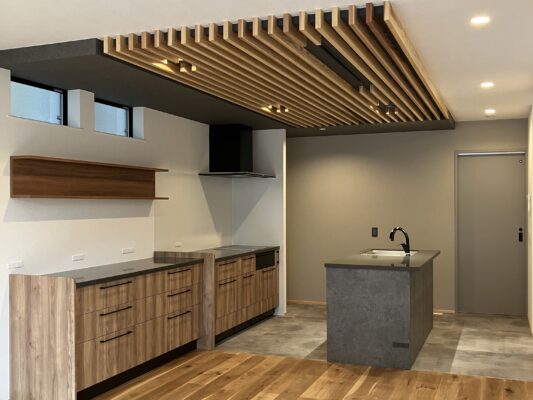 ダイニングキッチンスペースは、広い空間に変化を付けたいという事で、1段天井を下げています。途中、o様のアイディアで木製ルーバーを取り付ける事になりました。リビングのヘリンボーン風の床の張り方といい、こだわりを感じる部分です。