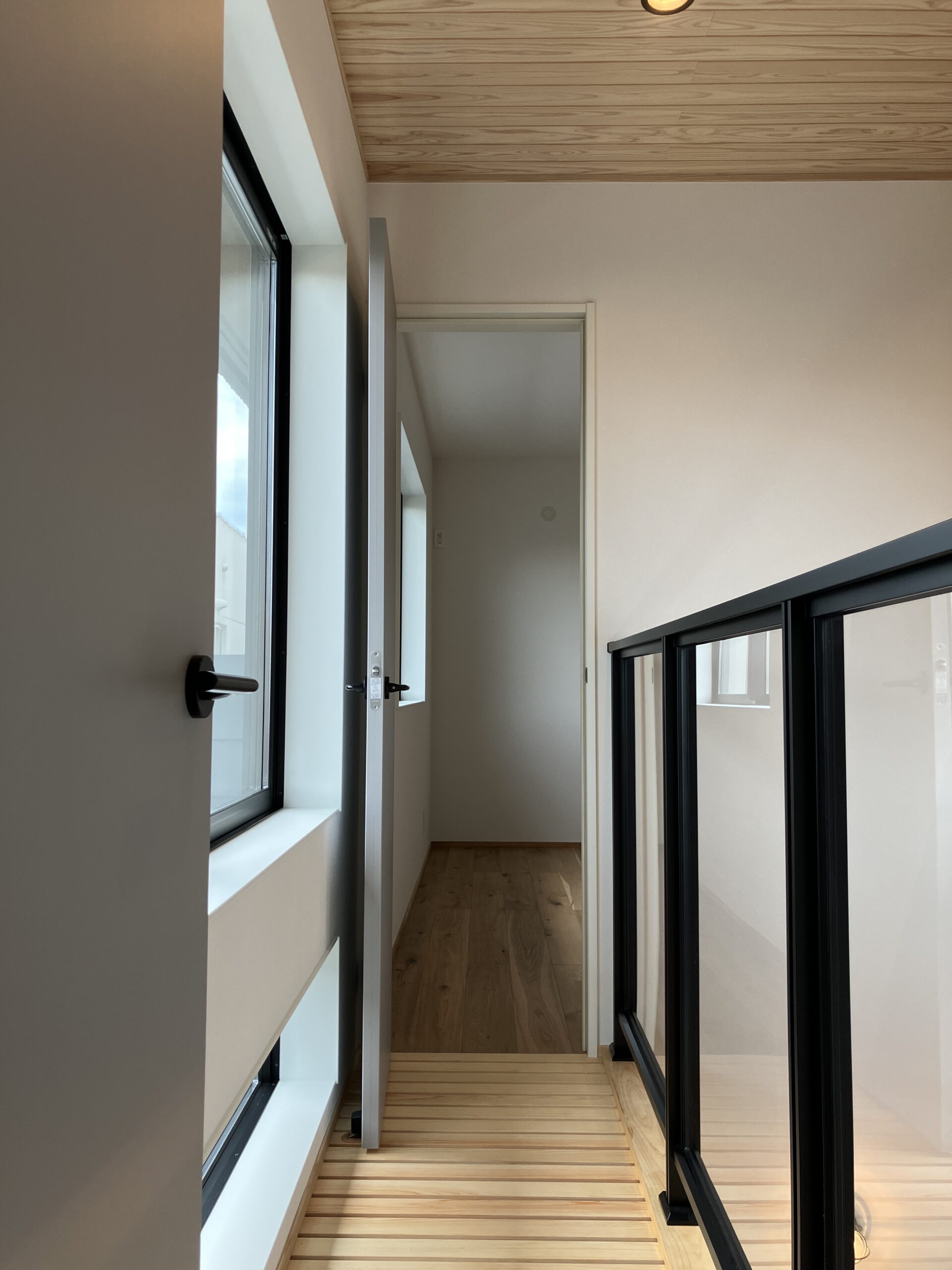 アウトドアリビングの上には、吹き抜けとキャットウォーク。いつものミノワ仕様の手すりではなく、今回はアルミの手すりを採用されました。小さめの吹抜けなので、視界が通って広く見えます👍外観は町並みに配慮されていますが、中に入るとスタイリッシュなko様邸です。