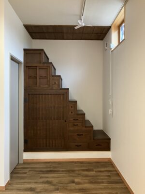 離れは、ご来場された方々にも、「ミノワさんらしいね」とおっしゃっていただけるほどの和の雰囲気です。玄関には旧家にあった丸窓を再現。犬山の城下町で良く観る格子模様を掛け障子に採用されました。玄関を通り正面には、旧家で使われていた収納階段がf木工さんによってきれいに蘇り、飾り棚として設置されています。