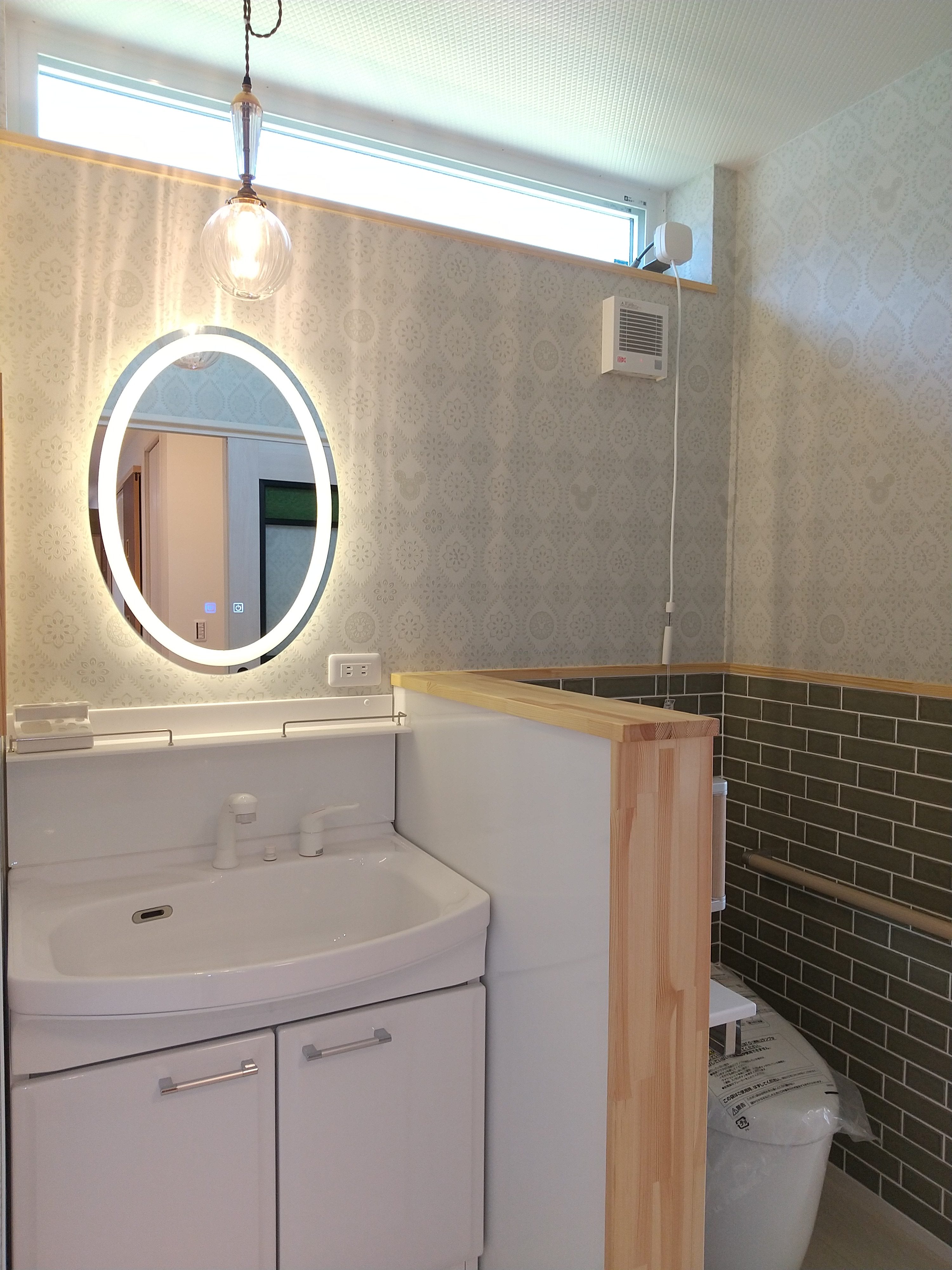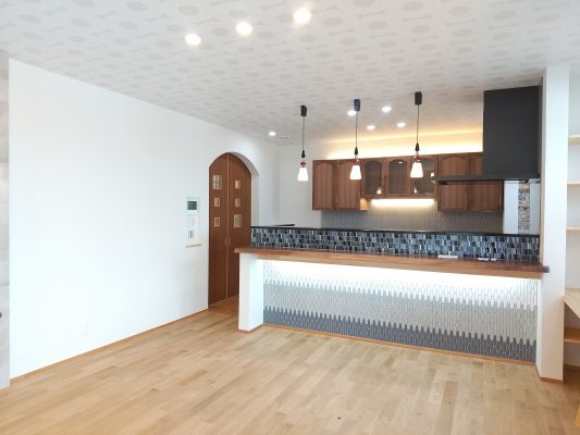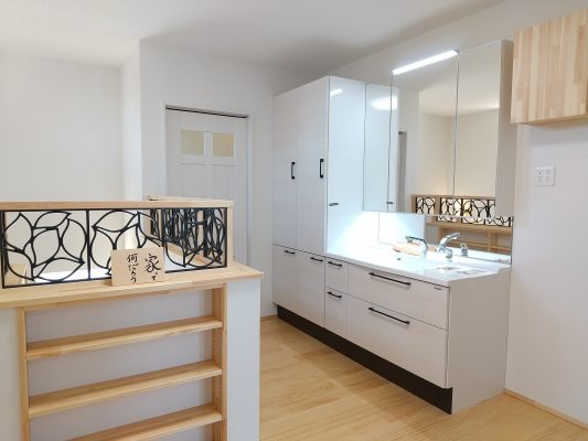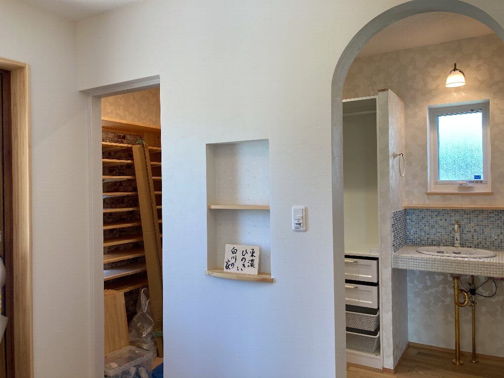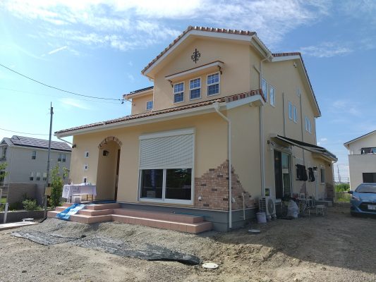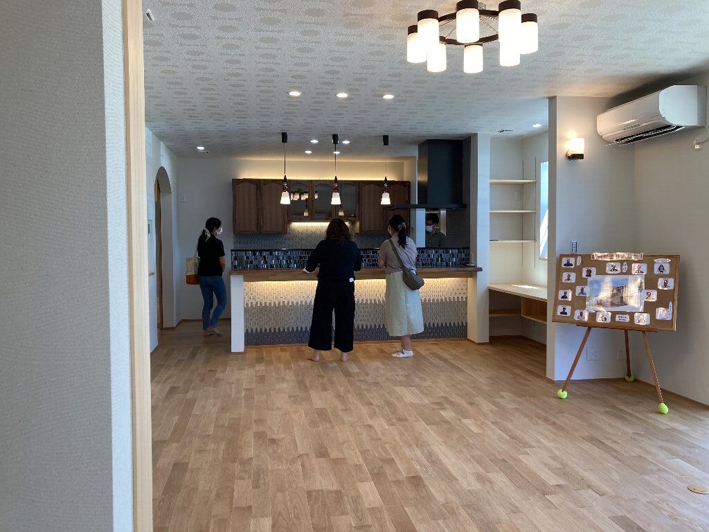 先週の土日に、完成見学会を開催いたしました。久しぶりに、両日ともにお天気が良く、ay様の患者様を含めて多くの方にご来場をいただきました。暑い中、ご来場いただきましてありがとうございました。市街化調整区域の為、建物が建てれる敷地が南北に長く、東の駐車場から早くから朝日が当たるay様邸。やっと冷房もかけれる状態になり、前日の夜から稼働させていただきました。建物が今までの熱で温まっているので心配でしたが、1階はLDKの壁掛けエアコン1台、2階は2台で十分涼しく、ミノワの高気密高断熱住宅を体感していただけました👍 久しぶりに土日晴れたのでキャンプに出掛けてしまい、珍しい南欧風住宅も見たかったけれど行けなかったわ~と言う方に少しay様邸のご紹介をいたします。 外観は、奥様の大好きなディ〇ニーランドにも建っていそうな、明るい南欧風。外壁には光触媒トップコート付きのジョリパッドが塗られています。ay様邸は、見た目だけではなく一つひとつの商品にもこだわられています👍光触媒は自浄作用があり、光があたることで汚れを自ら分解してくれます。キレイな状態が長く続くので明るい外壁によいですね。また光触媒は匂いも分解してくれるので、タクシーの内装に光触媒を吹き付けていると聞いたことがあります。太陽光が当たる外壁や一日中走り回るタクシーの内装に使うのはいい発想ですね👍    玄関に入ると正面にはステンドグラスが入った建具と、アイアン手摺、照明器具にもアイアンが施されていて、可愛らしい素敵な空間です。間取りは、洋風和風関係なく、今や定番化しつつあるシューズクロークにコロナ禍から皆さんご検討されるようになった手洗い用の洗面があります👍コロナの前でも手洗いうがいって大切だったのですが、コロナのお陰でその大切さをみんなが改めて感じた気もしますね。そして、来客用のトイレではありますが、外からちょっとの間トイレを我慢して帰って来た時に、玄関の近くにあるのも便利です。ya様邸は延べ床面積67坪と広く2世帯なので、この玄関と奥様ご主人の部屋の近くに1か所、2階の子世帯に1か所、合計3カ所にトイレを設けています。       玄関右手は、23帖のLDKとその南に8帖の和室があります。LDKには、総監督の奥様が一番楽しみにしてみえたキッチンスペースがあります。計画時からご主人とこのカウンターで座る椅子を探しに行かれ、昨年の今頃には「もう椅子買ったよ~」と私も見学会で教えていただいたことを覚えています。お気に入りの椅子に合わせてタイルの色なども考えられました。いろんなタイルやクロスを組み合わせるセンスは、上級者ですね👍私達は、どうしても飽きがこないように「どシンプル」にまとめようとしてしまいます💦奥様の大好きなディ〇ニーランドは、いろんな色が組み合わされた内装が多く、でもなんかまとまってる空間。何度も行かれて、そのセンスが奥様に自然と身に付いた感じなのかなぁ~と思います。こりゃなかなか真似できないですね。 そして、和室の入り口はもっと洋風になるのかと思いきや、建具屋さんも嬉しい発注!組子をふんだんに使用した和風の建具が納まっています。これも何故かこの空間に合っていますよね!凄いです~総監督👍      先ほどの玄関正面のステンドが入った扉の奥は、廊下兼収納になっています。お客様が通らない空間なので、通路と収納を兼用してみえます。これも、総監督の本業(主婦)ならではのグッドアイディアですね👍👍      通路の突き当りには、シンデレラ城のトイレ(笑)左手は奥様の部屋、右手はご主人の部屋があります。ご主人は患者さんの腰痛を治して、ご自身が腰痛とか💦その腰痛になってしまった時にトイレが近い方が良いと、ご主人の部屋からもアクセスできるようになっています。腰痛の際は1歩でも歩きたくないですからね~👍👍👍そして、通路に沿って計画された水廻りは手摺に加えてベンチも設置。腰痛の時には片足をあげて衣類の脱ぎ着できませんからね。     キッチンの裏手には、勝手口と2個目の階段があります。ご家族5人の構成が、親世帯+お子様1名と子世帯という構成の為、親世帯が少し2階に割り込む形になり、子世帯のプライベートに配慮した計画となっています。    廊下の途中に扉を設けて、親世帯と子世帯を区切っています。玄関からの階段を上がると子世帯用のトイレと広めの洗面。洗面の横には小さな冷蔵庫とレンジを置けるスペースを確保しています。ちょっとお茶だけ飲みたいわなんて時にコップくらいは洗面であらってもいいですね。   その他2階は、セカンドリビング、寝室、子供部屋が設けられています。それにしても、総監督はすごいですね。どこからこの壁紙にそっくりな照明器具を探してみえたのでしょう💦凄い!     その他の照明器具も、玄関のアイアンに合わせて選ばれたり、お手洗いはどこも陰影が楽しめるデザインの物を選ばれています。   親世帯のご主人と奥様の