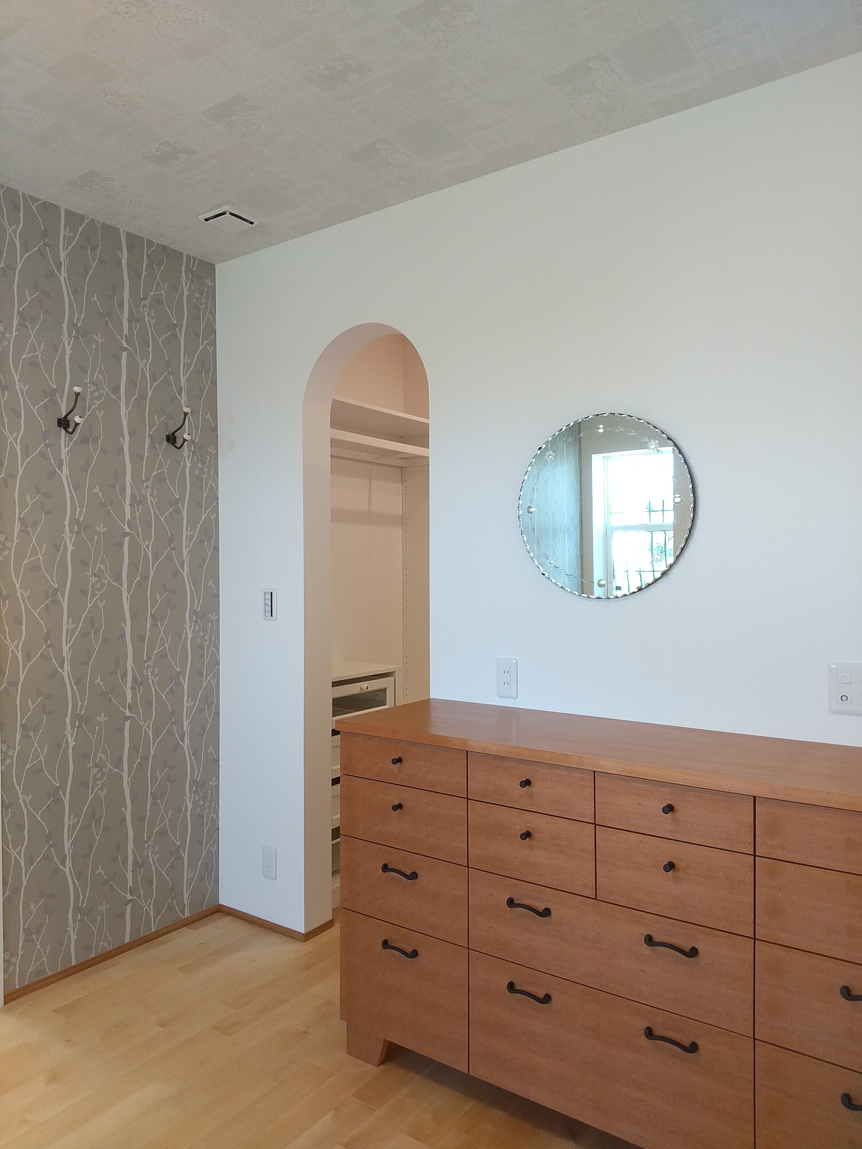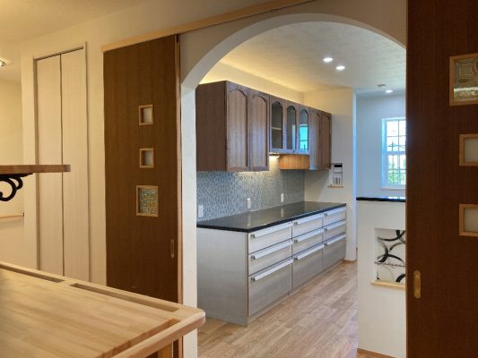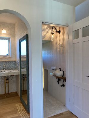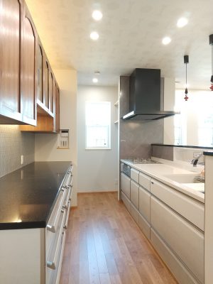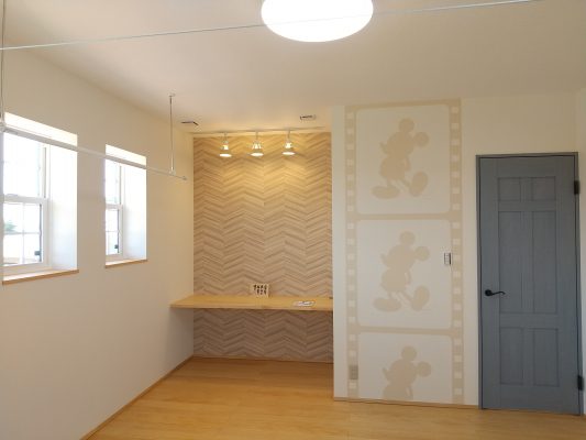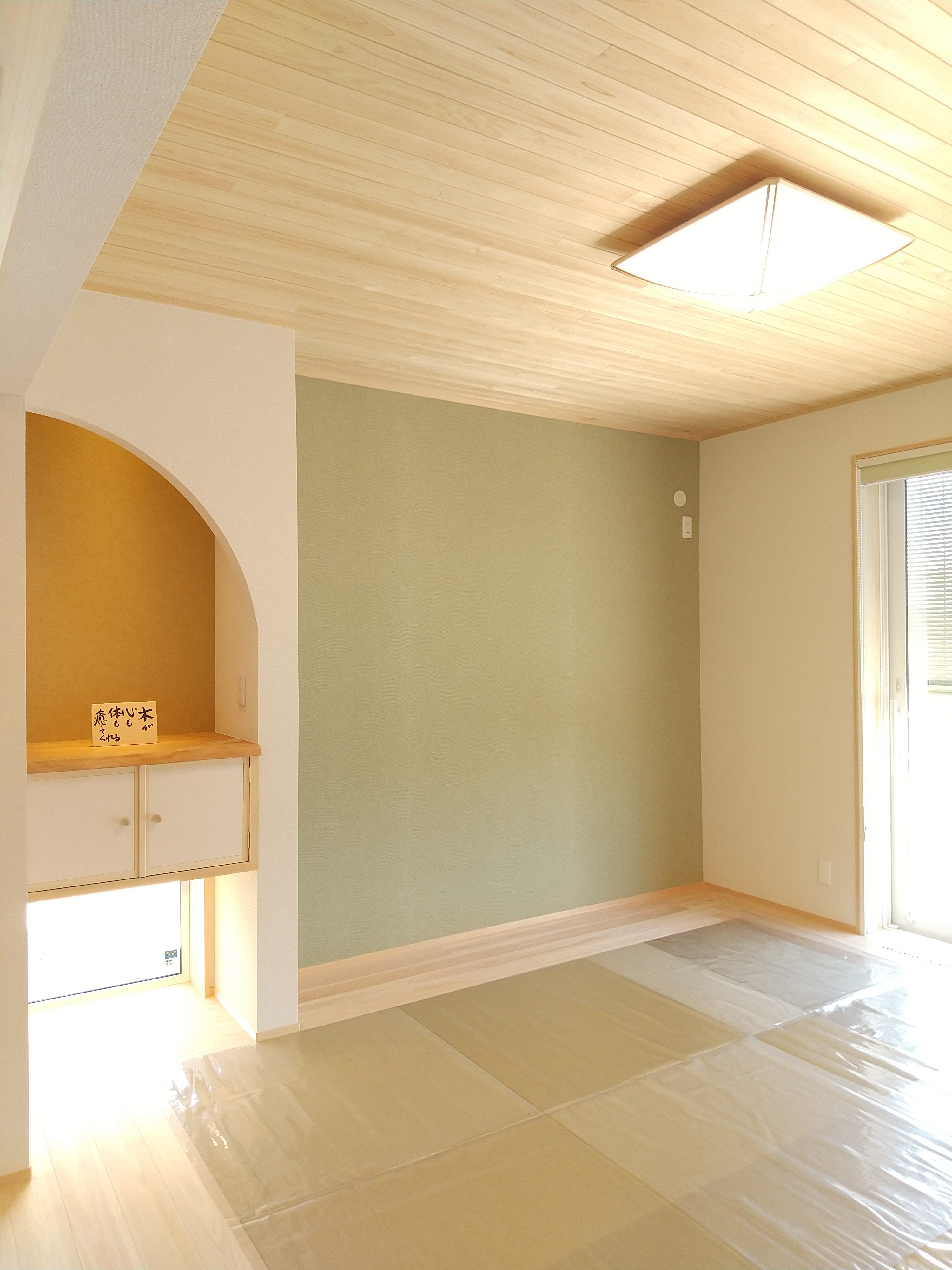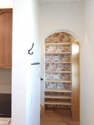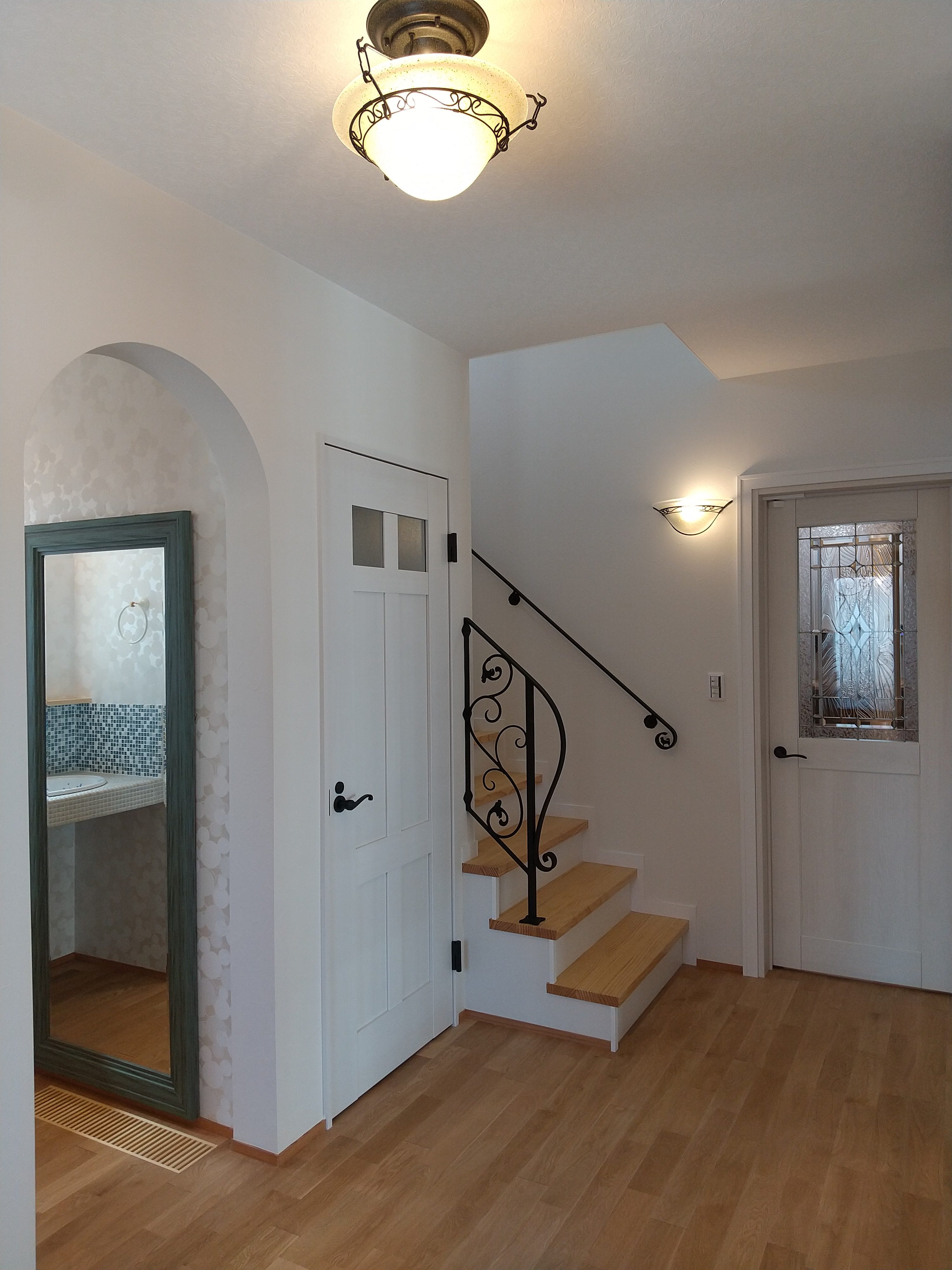 先週の土日に、完成見学会を開催いたしました。久しぶりに、両日ともにお天気が良く、ay様の患者様を含めて多くの方にご来場をいただきました。暑い中、ご来場いただきましてありがとうございました。市街化調整区域の為、建物が建てれる敷地が南北に長く、東の駐車場から早くから朝日が当たるay様邸。やっと冷房もかけれる状態になり、前日の夜から稼働させていただきました。建物が今までの熱で温まっているので心配でしたが、1階はLDKの壁掛けエアコン1台、2階は2台で十分涼しく、ミノワの高気密高断熱住宅を体感していただけました👍 久しぶりに土日晴れたのでキャンプに出掛けてしまい、珍しい南欧風住宅も見たかったけれど行けなかったわ~と言う方に少しay様邸のご紹介をいたします。 外観は、奥様の大好きなディ〇ニーランドにも建っていそうな、明るい南欧風。外壁には光触媒トップコート付きのジョリパッドが塗られています。ay様邸は、見た目だけではなく一つひとつの商品にもこだわられています👍光触媒は自浄作用があり、光があたることで汚れを自ら分解してくれます。キレイな状態が長く続くので明るい外壁によいですね。また光触媒は匂いも分解してくれるので、タクシーの内装に光触媒を吹き付けていると聞いたことがあります。太陽光が当たる外壁や一日中走り回るタクシーの内装に使うのはいい発想ですね👍    玄関に入ると正面にはステンドグラスが入った建具と、アイアン手摺、照明器具にもアイアンが施されていて、可愛らしい素敵な空間です。間取りは、洋風和風関係なく、今や定番化しつつあるシューズクロークにコロナ禍から皆さんご検討されるようになった手洗い用の洗面があります👍コロナの前でも手洗いうがいって大切だったのですが、コロナのお陰でその大切さをみんなが改めて感じた気もしますね。そして、来客用のトイレではありますが、外からちょっとの間トイレを我慢して帰って来た時に、玄関の近くにあるのも便利です。ya様邸は延べ床面積67坪と広く2世帯なので、この玄関と奥様ご主人の部屋の近くに1か所、2階の子世帯に1か所、合計3カ所にトイレを設けています。       玄関右手は、23帖のLDKとその南に8帖の和室があります。LDKには、総監督の奥様が一番楽しみにしてみえたキッチンスペースがあります。計画時からご主人とこのカウンターで座る椅子を探しに行かれ、昨年の今頃には「もう椅子買ったよ~」と私も見学会で教えていただいたことを覚えています。お気に入りの椅子に合わせてタイルの色なども考えられました。いろんなタイルやクロスを組み合わせるセンスは、上級者ですね👍私達は、どうしても飽きがこないように「どシンプル」にまとめようとしてしまいます💦奥様の大好きなディ〇ニーランドは、いろんな色が組み合わされた内装が多く、でもなんかまとまってる空間。何度も行かれて、そのセンスが奥様に自然と身に付いた感じなのかなぁ~と思います。こりゃなかなか真似できないですね。 そして、和室の入り口はもっと洋風になるのかと思いきや、建具屋さんも嬉しい発注!組子をふんだんに使用した和風の建具が納まっています。これも何故かこの空間に合っていますよね!凄いです~総監督👍      先ほどの玄関正面のステンドが入った扉の奥は、廊下兼収納になっています。お客様が通らない空間なので、通路と収納を兼用してみえます。これも、総監督の本業(主婦)ならではのグッドアイディアですね👍👍      通路の突き当りには、シンデレラ城のトイレ(笑)左手は奥様の部屋、右手はご主人の部屋があります。ご主人は患者さんの腰痛を治して、ご自身が腰痛とか💦その腰痛になってしまった時にトイレが近い方が良いと、ご主人の部屋からもアクセスできるようになっています。腰痛の際は1歩でも歩きたくないですからね~👍👍👍そして、通路に沿って計画された水廻りは手摺に加えてベンチも設置。腰痛の時には片足をあげて衣類の脱ぎ着できませんからね。     キッチンの裏手には、勝手口と2個目の階段があります。ご家族5人の構成が、親世帯+お子様1名と子世帯という構成の為、親世帯が少し2階に割り込む形になり、子世帯のプライベートに配慮した計画となっています。    廊下の途中に扉を設けて、親世帯と子世帯を区切っています。玄関からの階段を上がると子世帯用のトイレと広めの洗面。洗面の横には小さな冷蔵庫とレンジを置けるスペースを確保しています。ちょっとお茶だけ飲みたいわなんて時にコップくらいは洗面であらってもいいですね。   その他2階は、セカンドリビング、寝室、子供部屋が設けられています。それにしても、総監督はすごいですね。どこからこの壁紙にそっくりな照明器具を探してみえたのでしょう💦凄い!     その他の照明器具も、玄関のアイアンに合わせて選ばれたり、お手洗いはどこも陰影が楽しめるデザインの物を選ばれています。   親世帯のご主人と奥様の