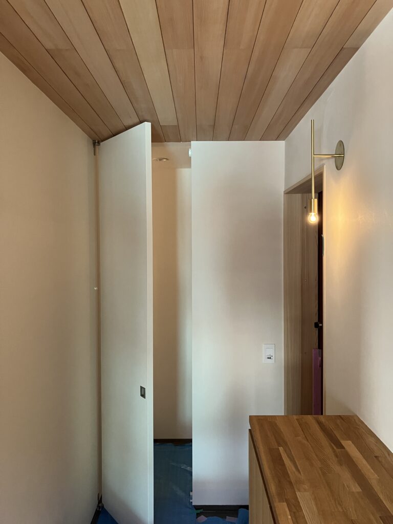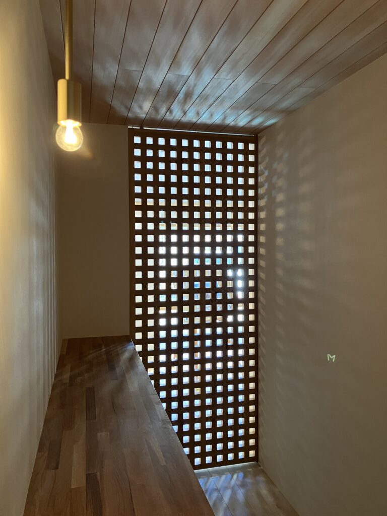 玄関は、明るいリビングからの光が、永田障子という建具の隙間から入り、何とも言えない良い雰囲気。猫ちゃんが2匹いるとの事で、玄関から飛び出していかない様にと、空気は玄関にも行き渡るように選ばれたとの事です。振り返ると、洗面やトイレ、脱衣室、パントリーに繋がる勝手口の扉があります。向井先生は、今回は裏動線を大切にして設計されたそうです。裏動線、いつもは家事動線と言うので気づきませんでしたが、住宅も店舗も、建物は基本的なところは一緒なのかも知れないなぁと思いました。