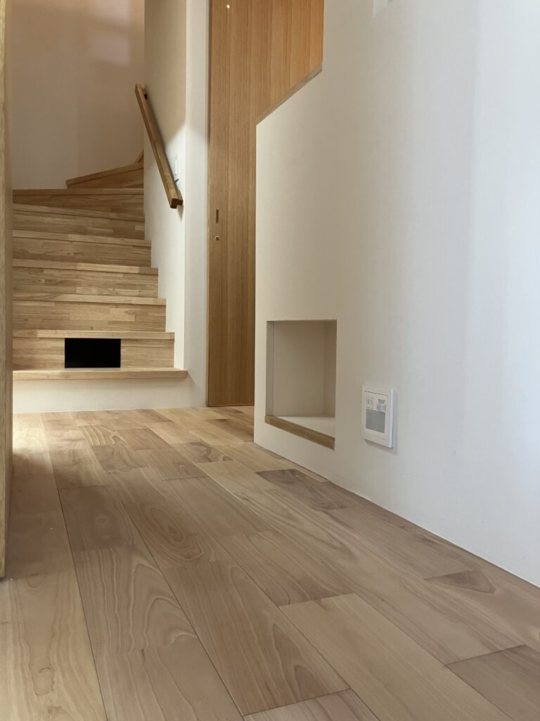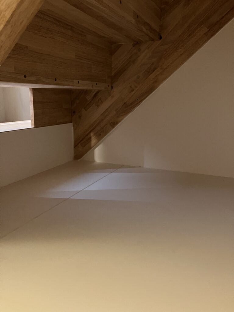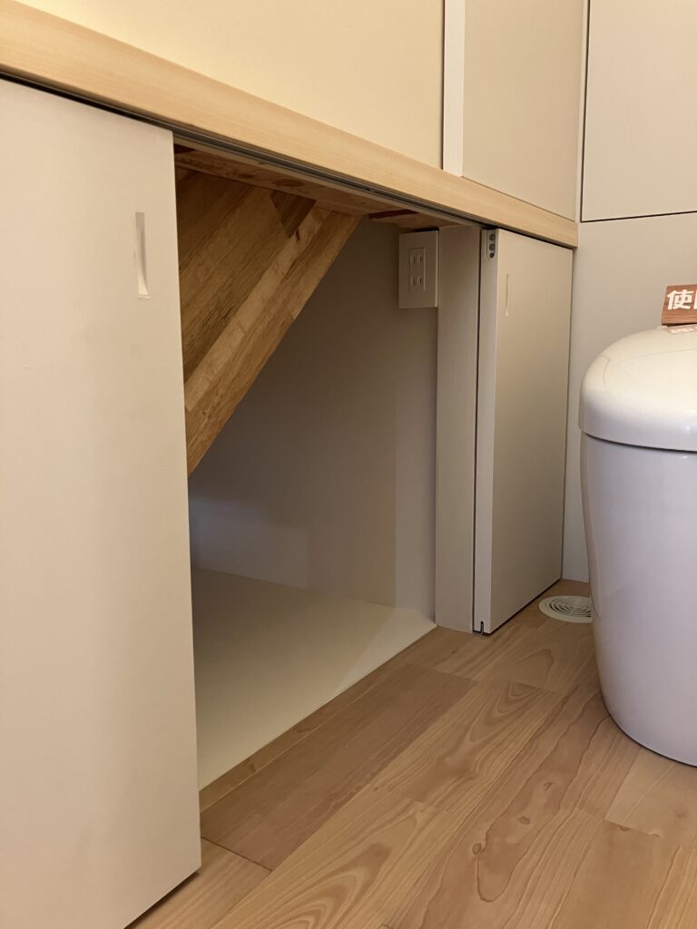 階段の下には、猫ちゃんのトイレが置けるようになっています。人間用のトイレの横にあるので、臭いも一緒に処理できます。お掃除しやすいように床にキッチンパネルが張られています。