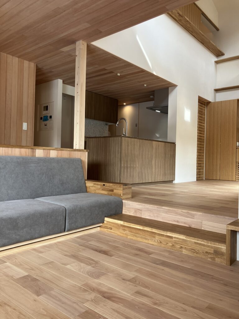 ダウンリビングと、ソファの裏に小上がりのタタミスペース。TVは置かないで、プロジェクターを置かれるとの事。最近はこのスタイルを選ばれる方が結構増えていますが、一応、TVも観れるように配線もしています。