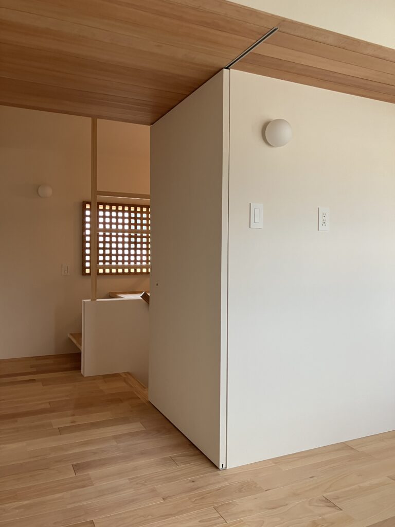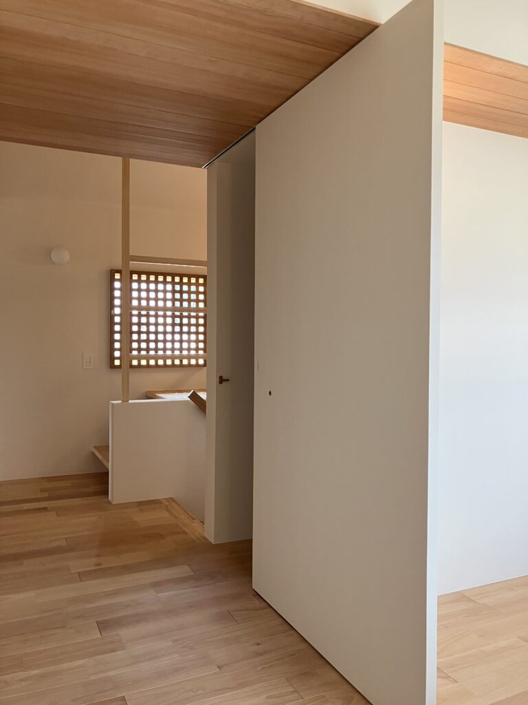 2階のトイレは、壁と一体的になった扉で、一見何もないように見える工夫がされています。部屋の一部に配置しているので、トイレがある事をアピールしたくないと言う、設計事務所さんらしい設えです。