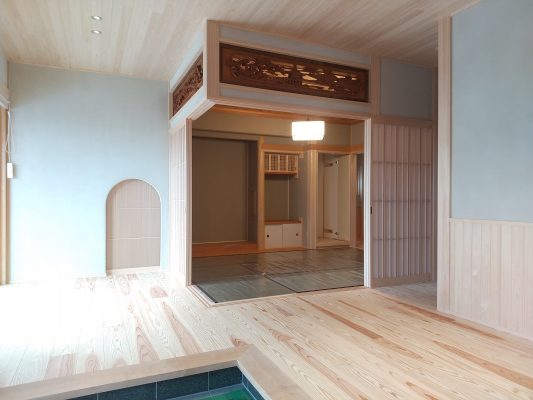 玄関から中に入ると、ひや~いきなりの見せ場!一般的には西側の和室の部屋は玄関と仕切り、広縁は玄関から見えない事が多いですが、広縁を玄関と一体にされて和室も玄関に開けた造りになっています。玄関引き戸からの明りと広縁の窓明りで、とても明るく開放的な素敵な空間です👍奥様が最後までこだわられた甲斐がありましたね!夜は照明もムーディーで、どこかの料亭の玄関の様です。