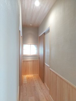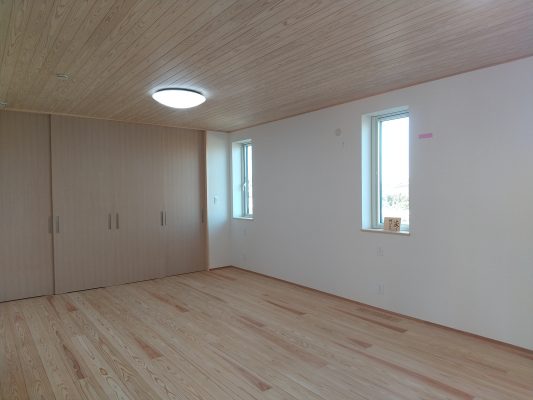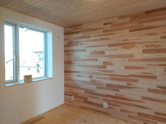 リカちゃんのお部屋は、k池棟梁の提案でLDK等に張った天井の羽目板の源平部分(白地と赤身がある部分)を張っています。寝室の色むらが無い羽目板もすっきりした印象で素敵ですが、これはまた違った感じでオシャレ👍無垢材は、ひと梱包にいろんな色目や模様の木が入っているので、一つひとつの空間が美しくみえるように、大工さん達が「この木はどこに使おうか」と気遣いをしてるのです~(笑)