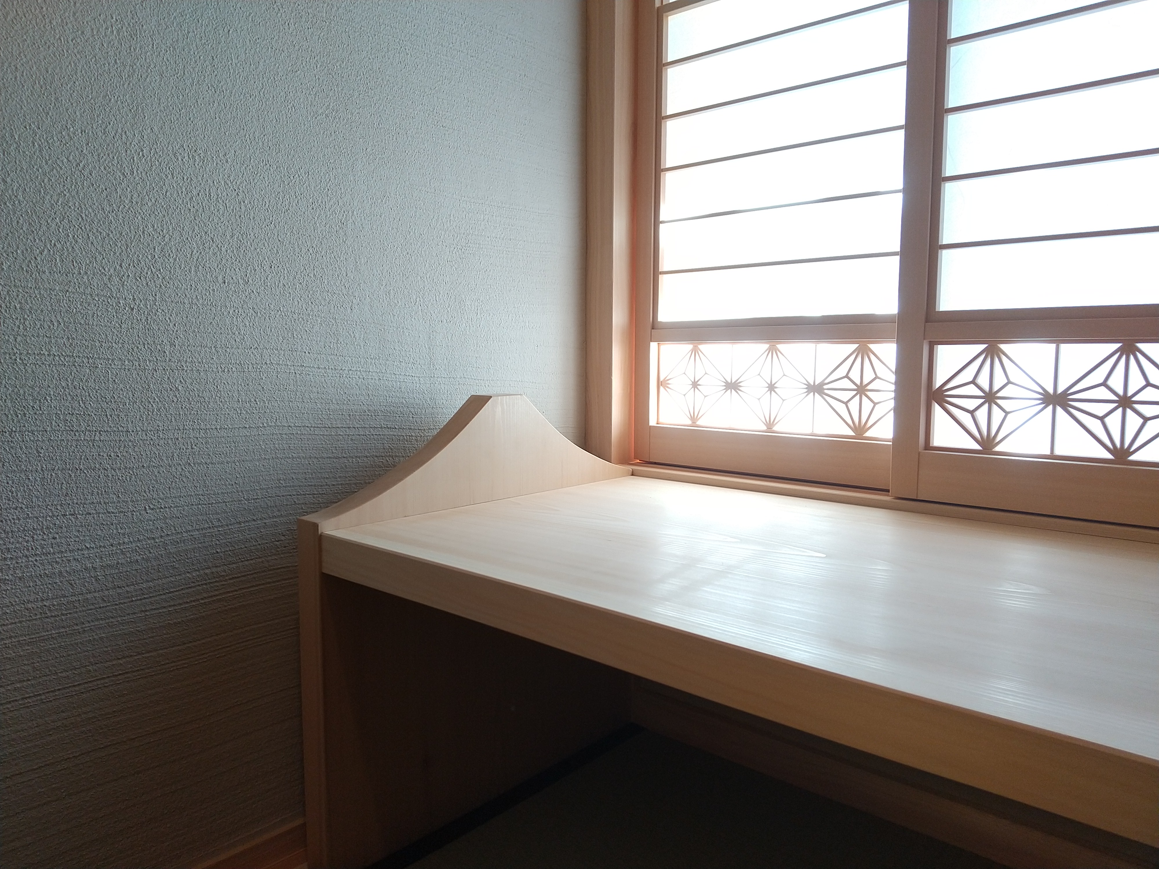 そして、和室の脇には書院(書斎スペース)。机の筆返しは富士山をモチーフにしています。k池棟梁、女心をくすぐるの上手いです👍キュンとなりました💗