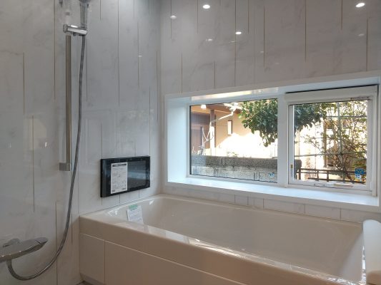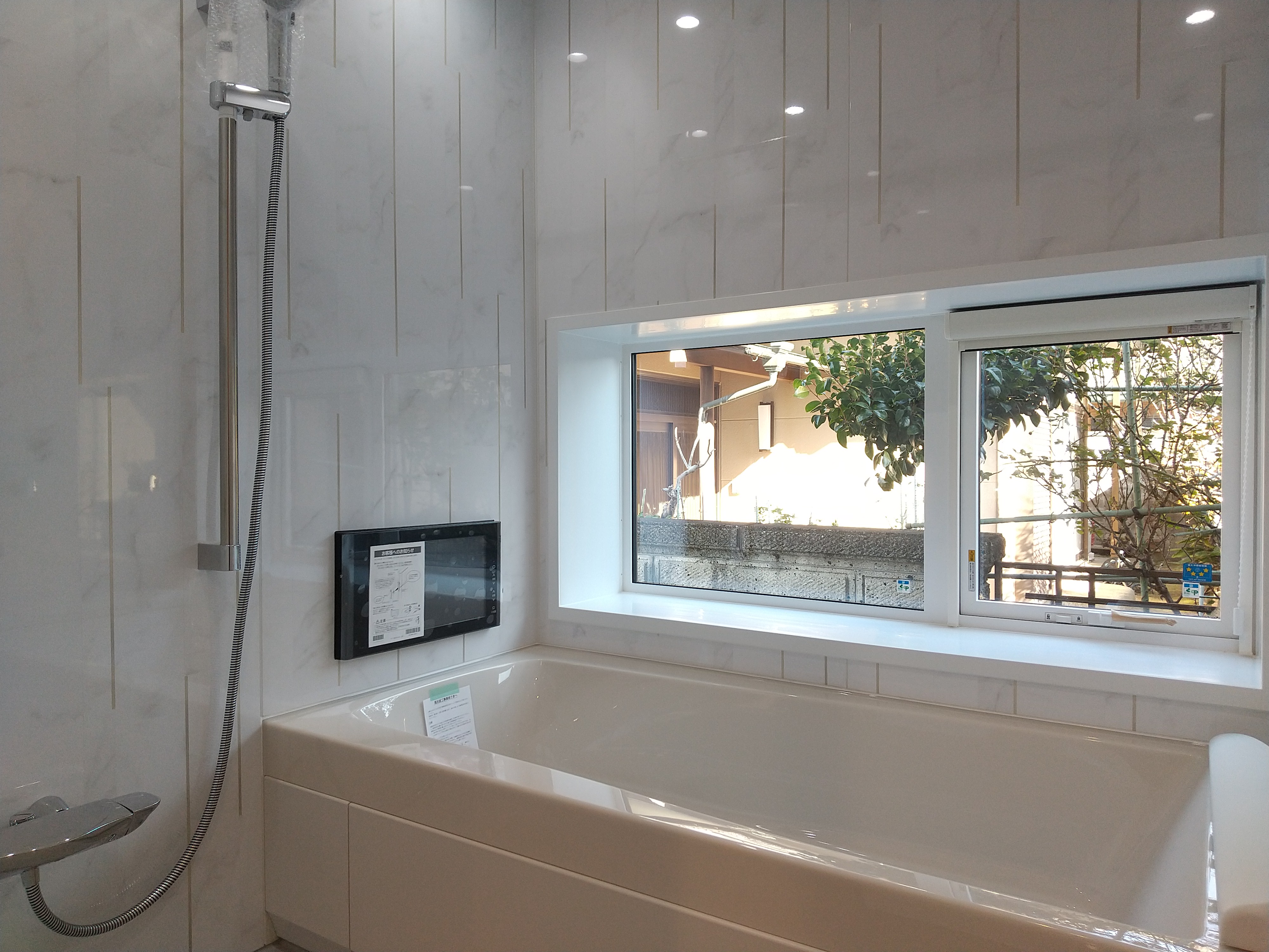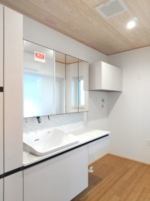 水廻りにもこだわりいっぱい。リカちゃんのお気に入りのウッドワンのキッチンに始まり、使いやすそうなカウンターが長いベッセルタイプの洗面化粧台、これから造られる坪庭を眺めながらゆったり入れるユニットバス。お客様用のトイレも(写真を撮り損ねましたので完成現場写真集へ載せます)天井には引き割った竹を張られて無垢のカウンター下には間接照明。ここはダークな色にされて落ち着いた雰囲気にされ、高級旅館の様な仕様です👍