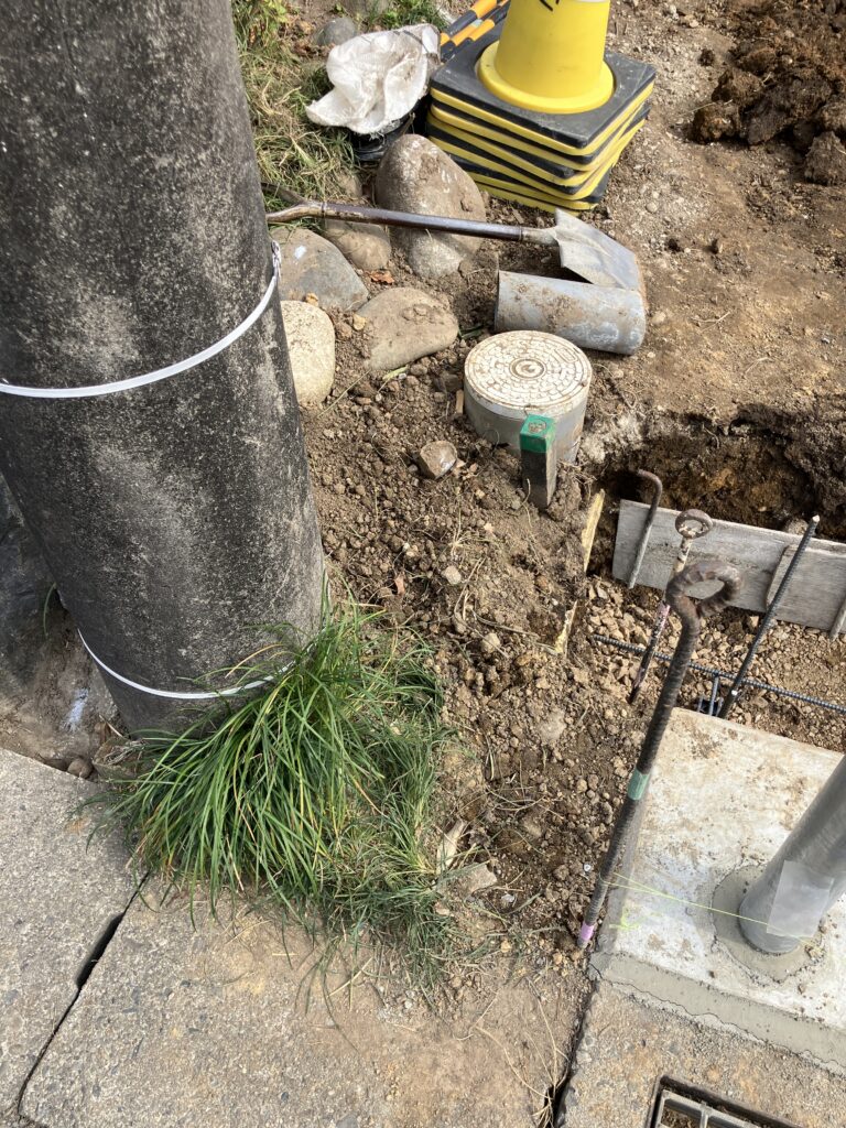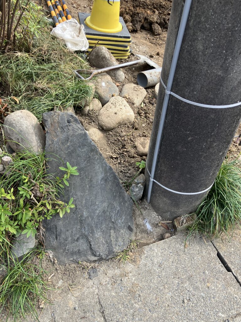 敷地内の電柱とカーブミラー、汚水桝、ガス配管といろいろと密集している部分は、ブロックを積むのをやめて、掘っていたら出てきた玉石を土留めとして積んでおくことにしました。何かやり替えの際に、固めてしまうとあとあと大変になるためです。