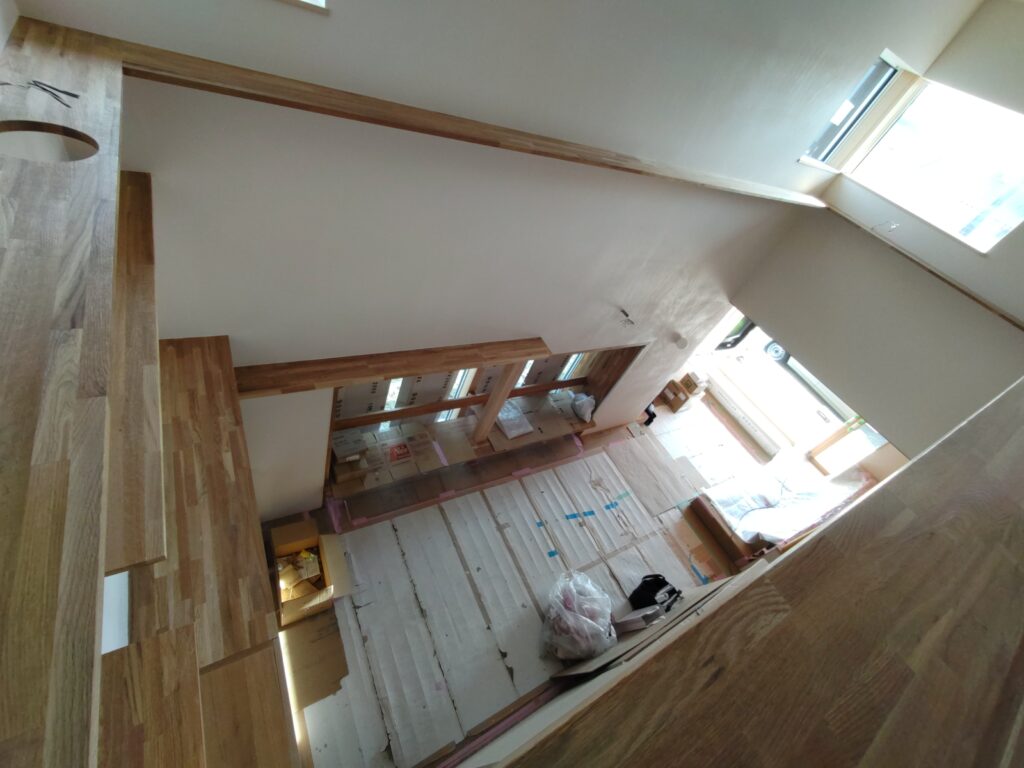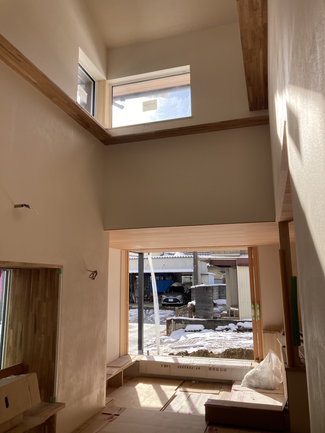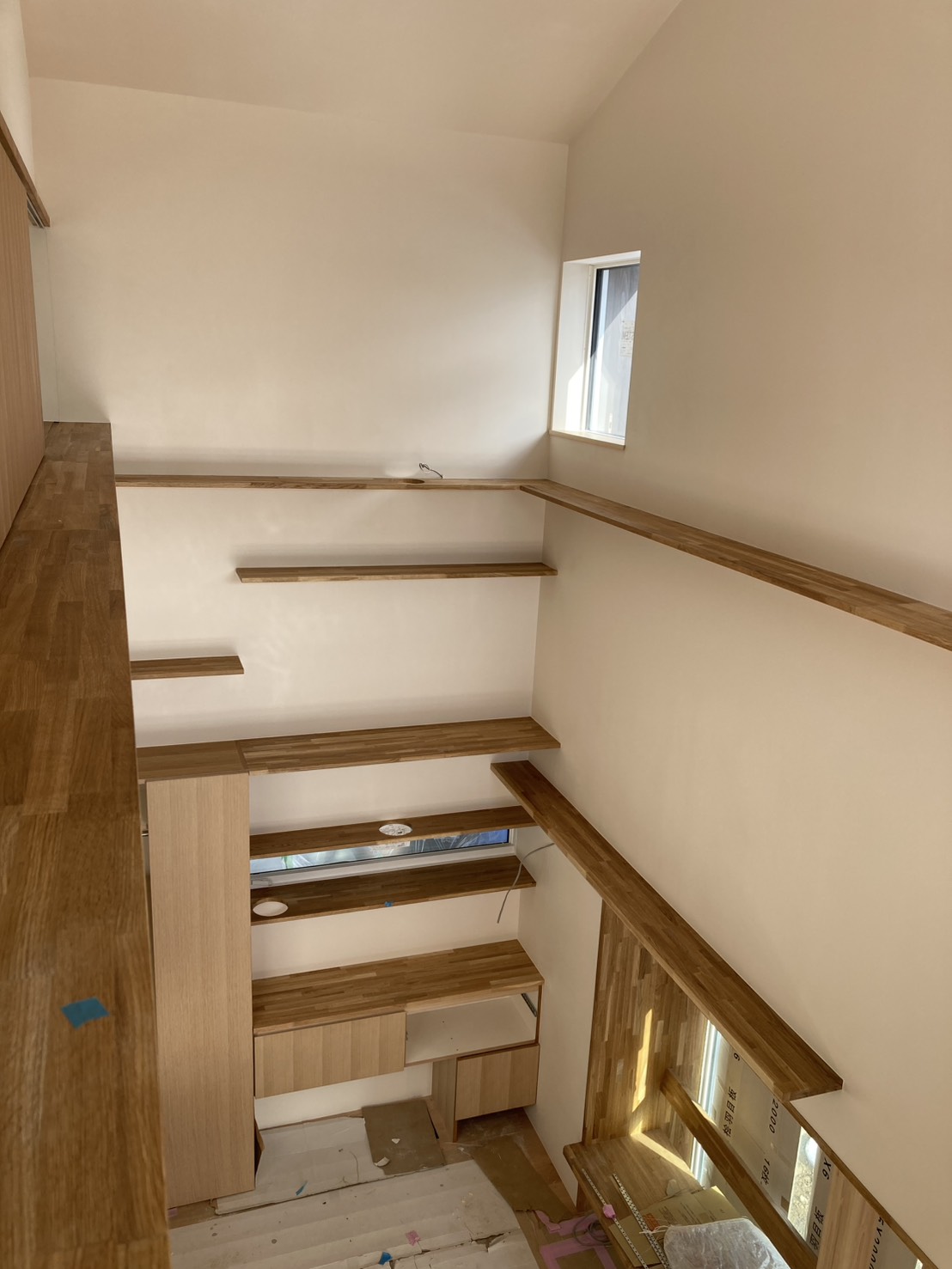 屋内の造作工事もいよいよ大詰め。吹き抜け部分には上階の仕上げ作業をするための鋼製足場が組まれています。足場が取れたら解放感満点の空間になります。