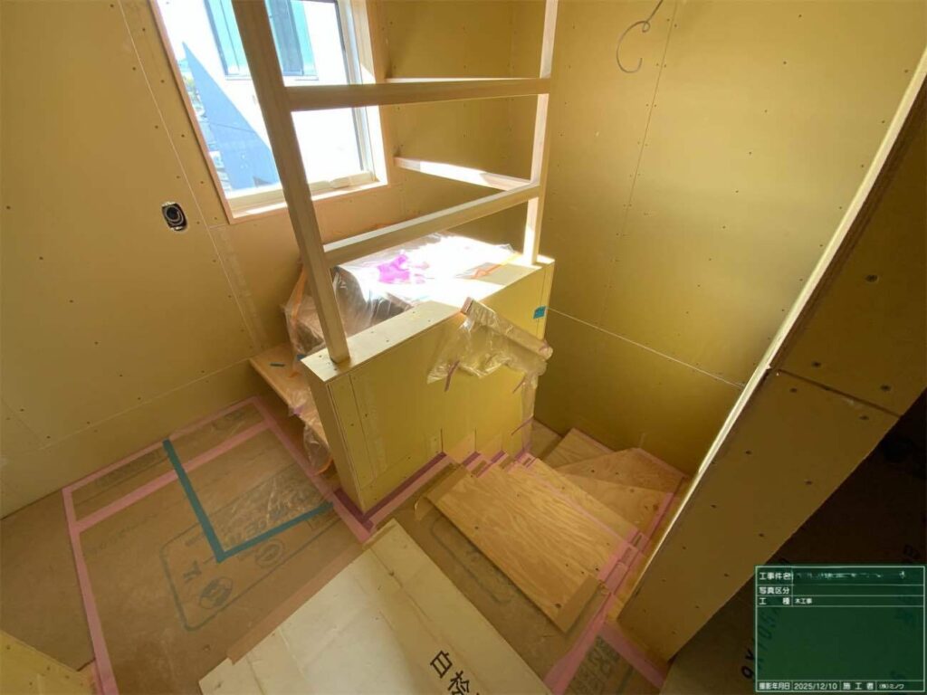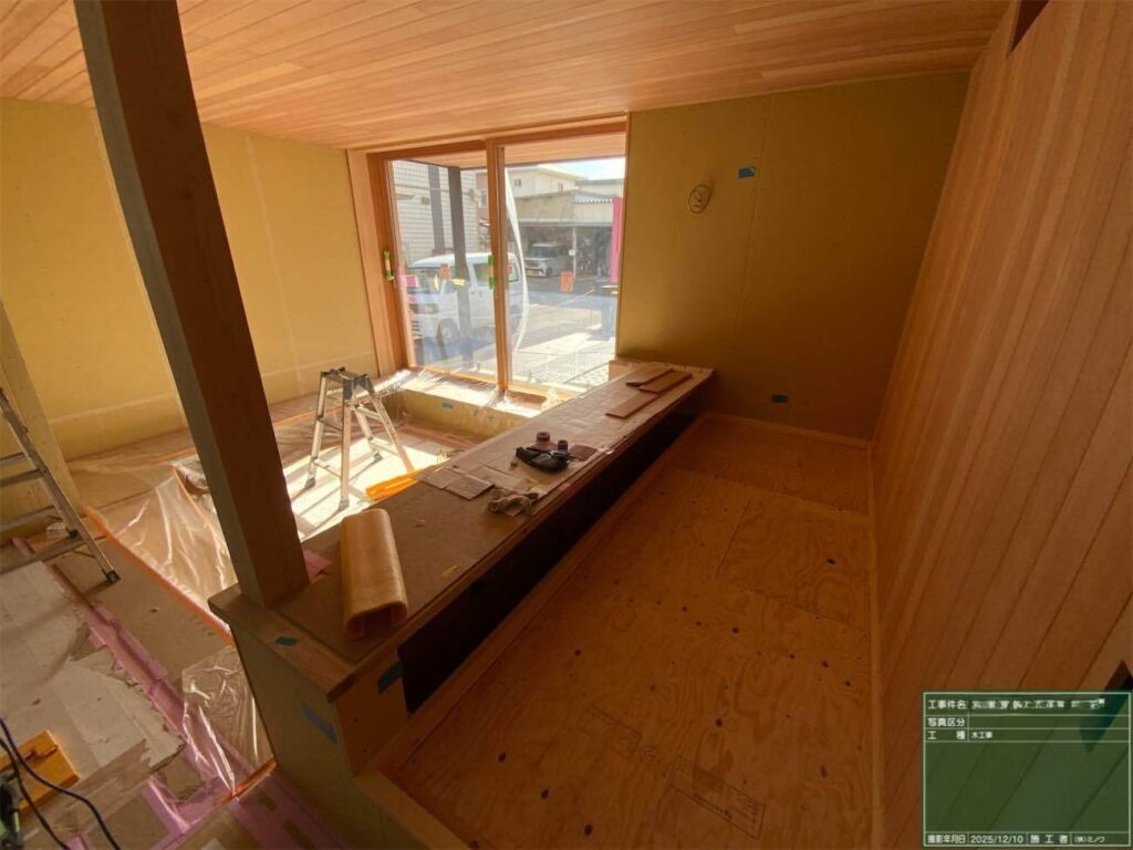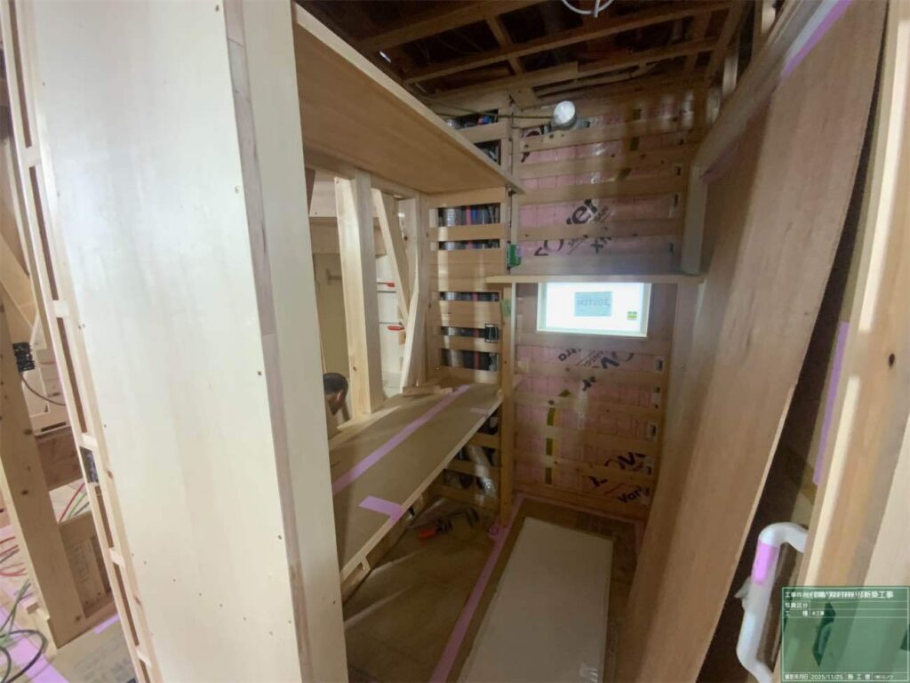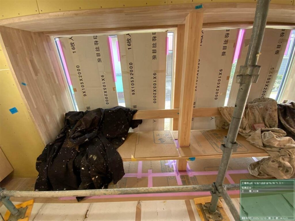 屋内の造作工事もいよいよ大詰め。吹き抜け部分には上階の仕上げ作業をするための鋼製足場が組まれています。足場が取れたら解放感満点の空間になります。