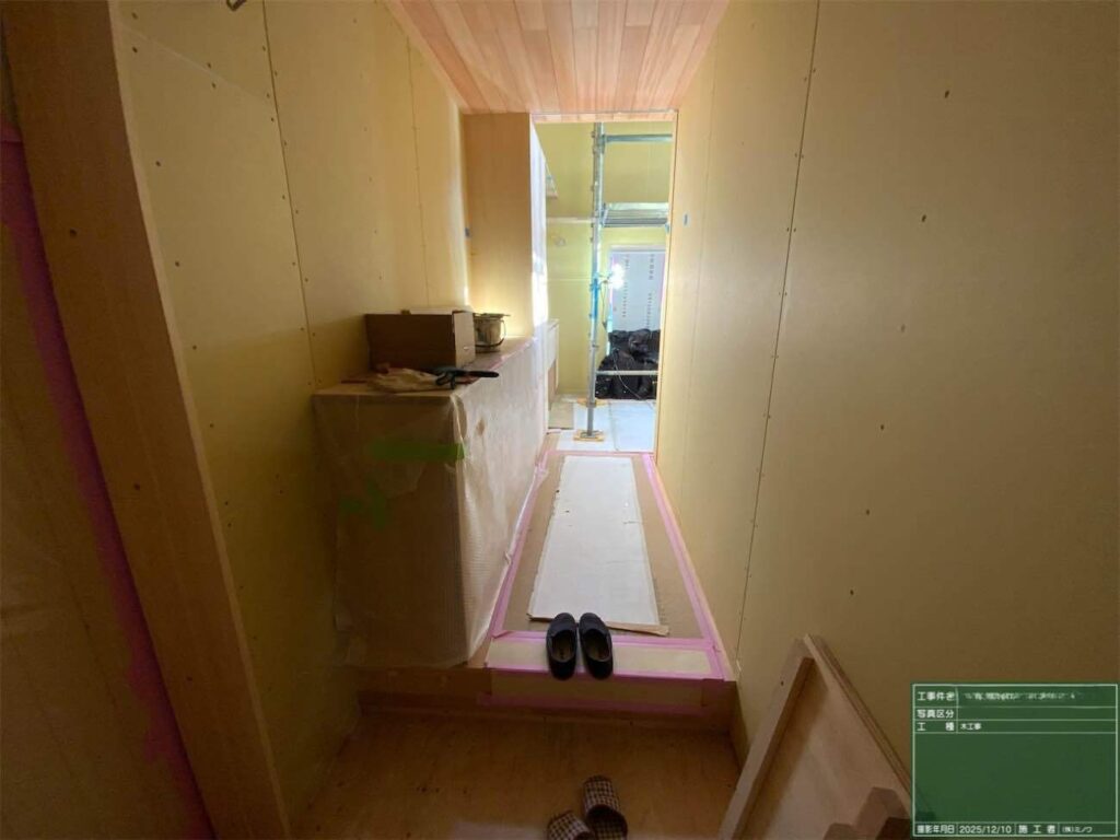 棟梁は外装下地に精を出しているため、内装は構造の検査を受けた直後の状態です。今回は構造計算により、屋内にも耐力壁が散見されています。