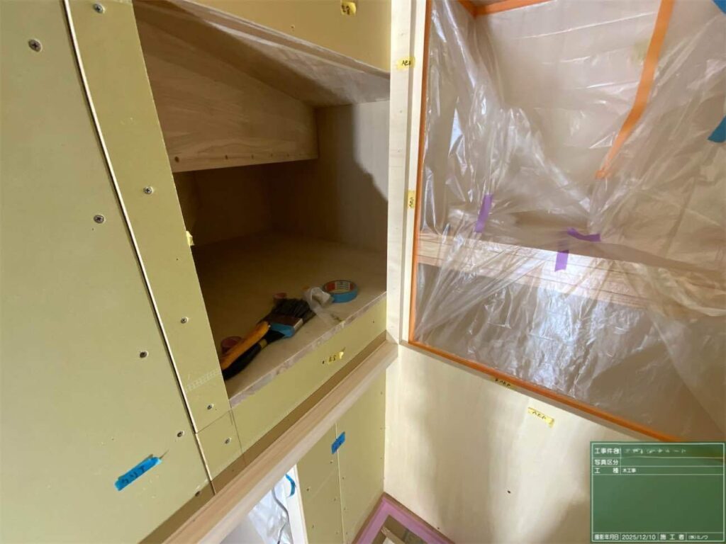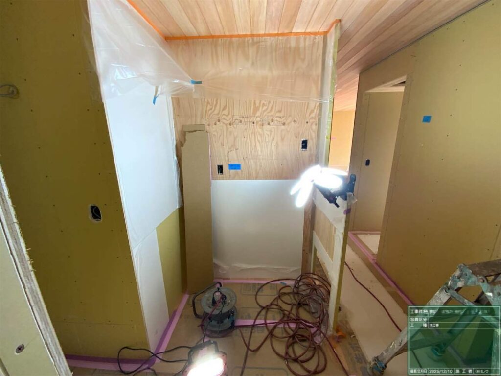 内部では造作工事、内装下地工事の追い込み真っ最中です。各箇所少々手間がかかるのでh谷川、k保木両大工が応援に駆けつけてくれました。だんだんと形になっていくm井先生の図面の内容。普段のミノワの建て方とは一味違った空間が見られます。