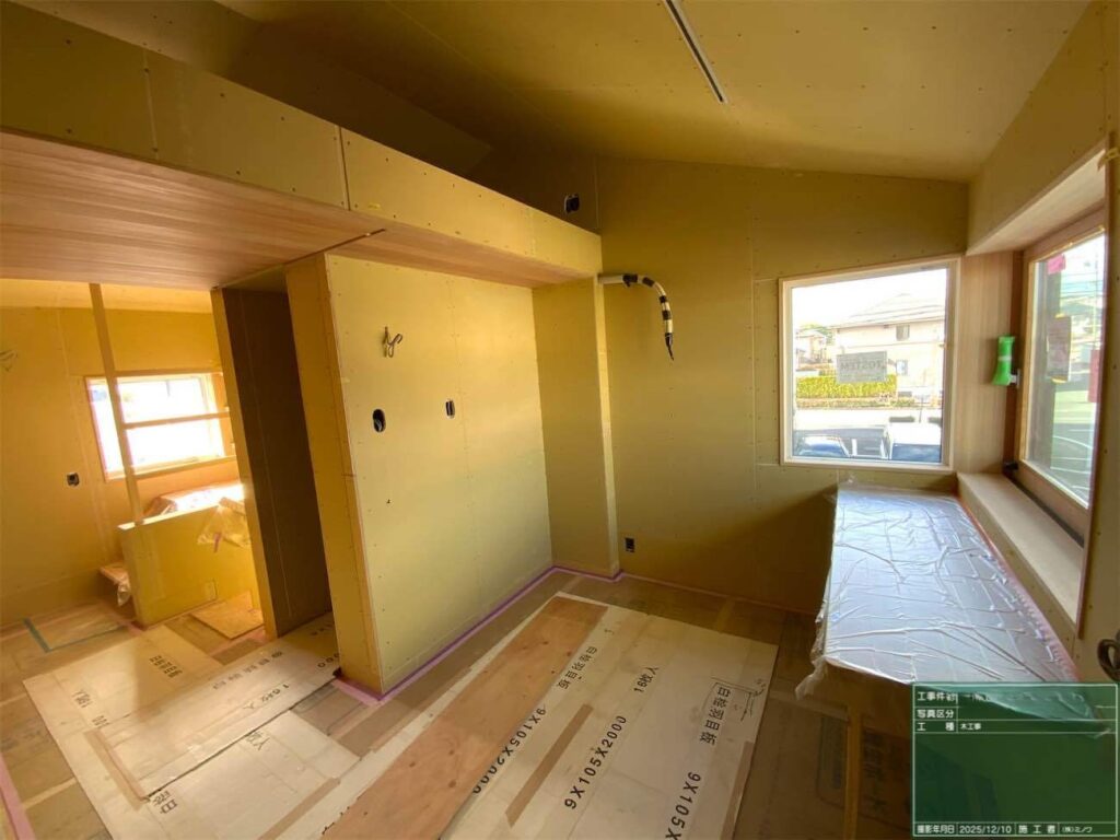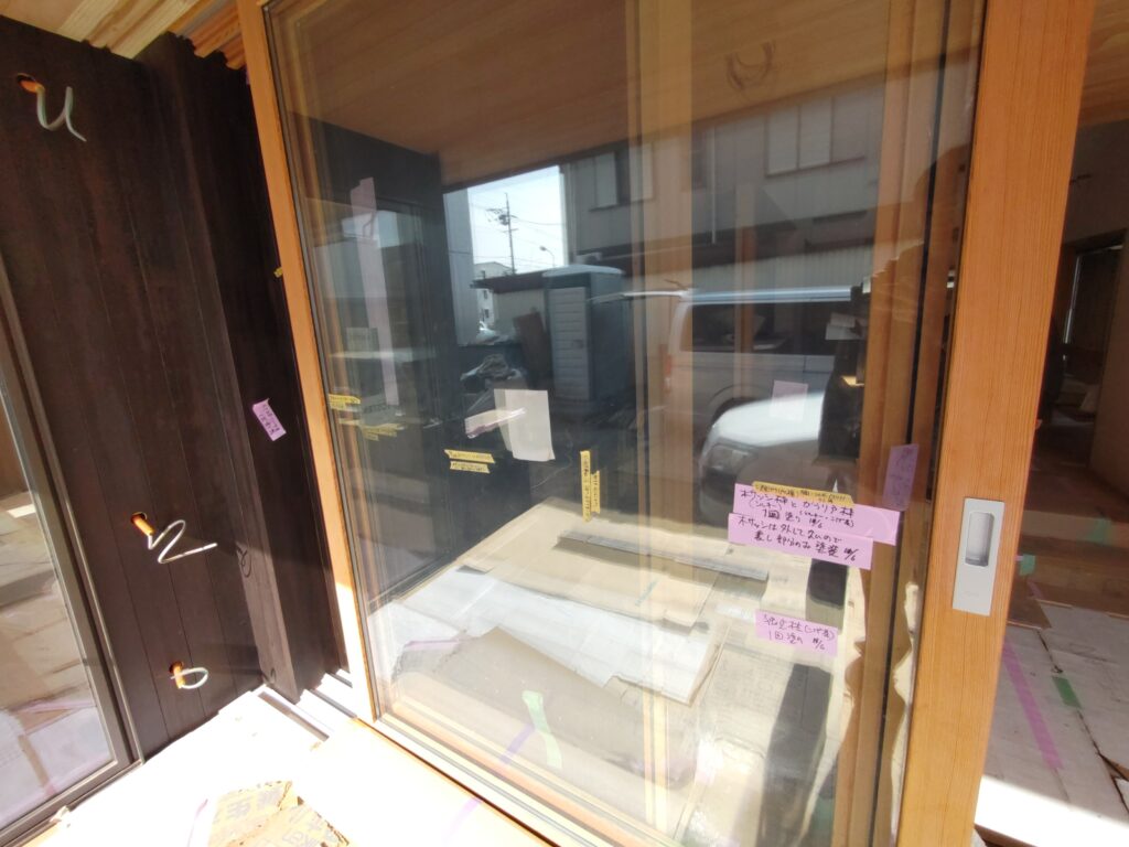 朝日による午前中の直射日光を防ぐためか、東面の大面積FIX窓の前には断熱材を立て掛けて日除けとしています。