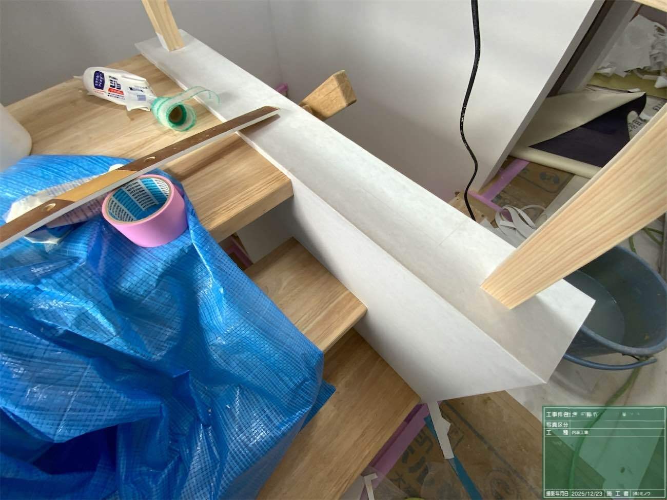 2階へ上がる階段が設けられました。階段下空間は余すところなく使い切るのがm井先生の設計の真骨頂。今回も階段下は4方向から使えるような収まりとなっています。