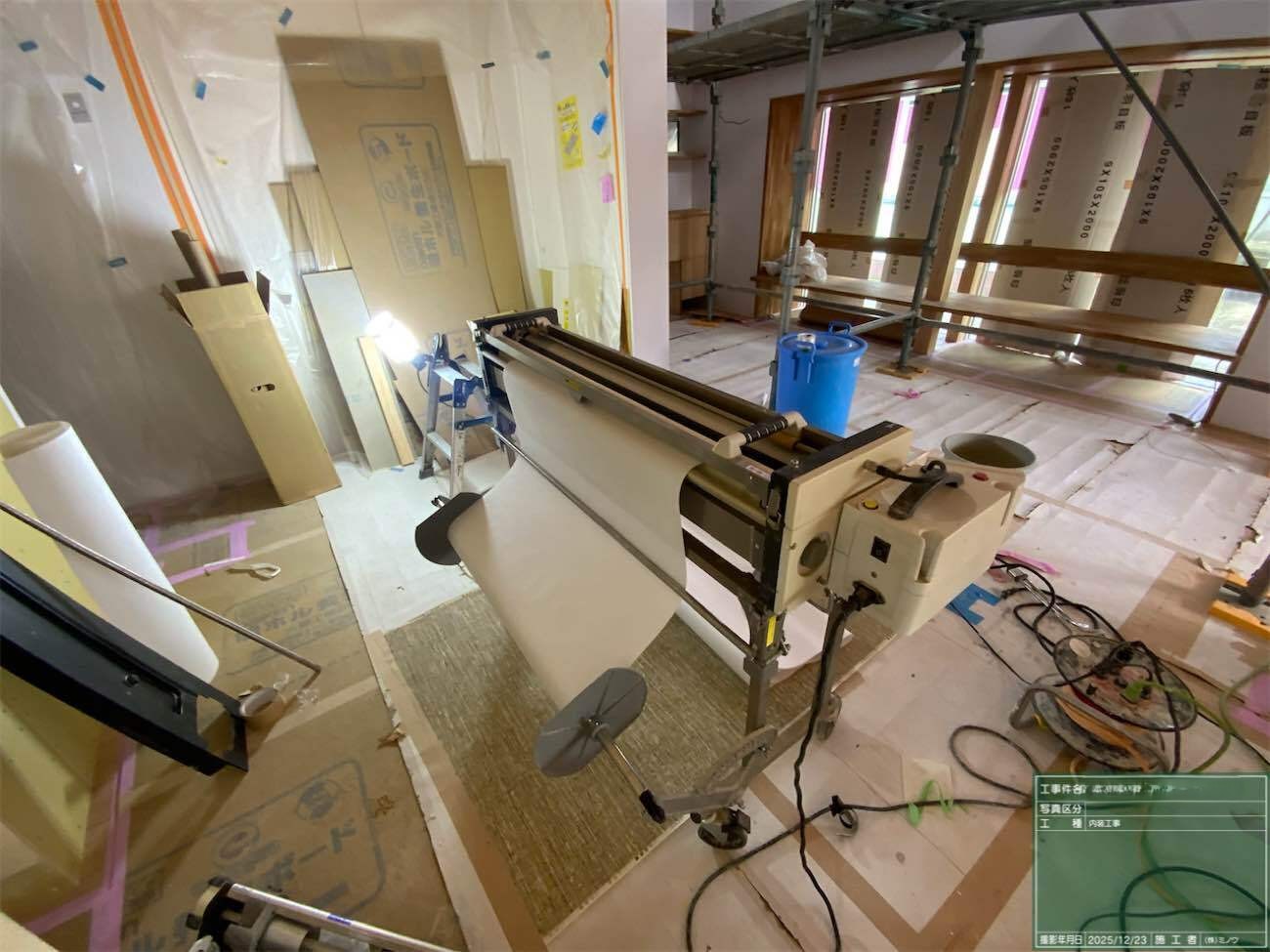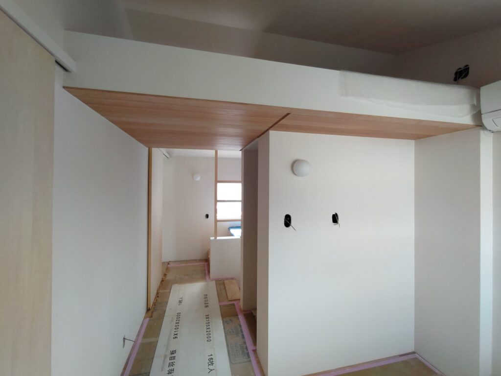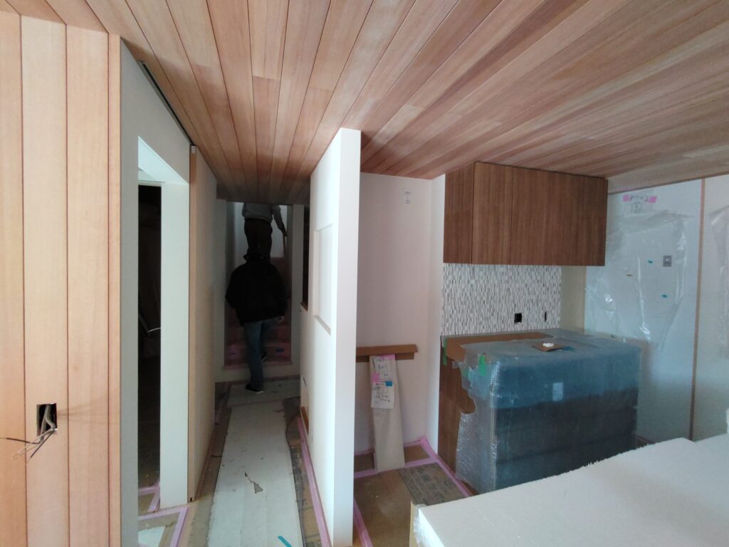 内装工事仕上の工程に入っています。天井板は大工さんの造作で羽目板を張っている個所が大部分です。壁に関しては漆喰ローラー塗り仕上部分(塗装業者さん)と漆喰コテ塗り仕上部分(左官業者さん)に分かれます。ローラー塗り部分の下地として『コバウ』なる紙を貼るためクロス業者さんも現場に入っています。