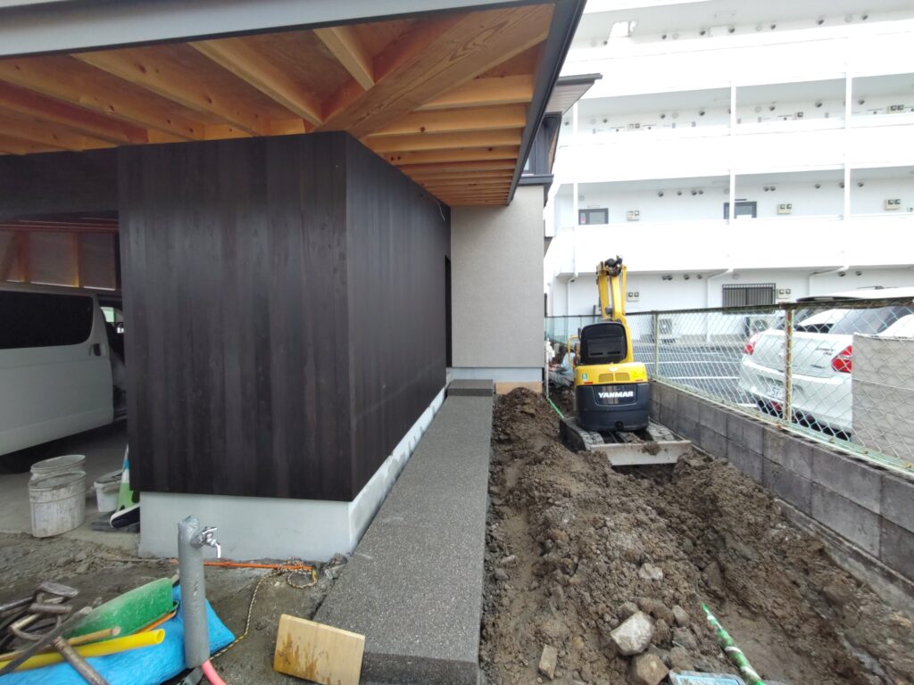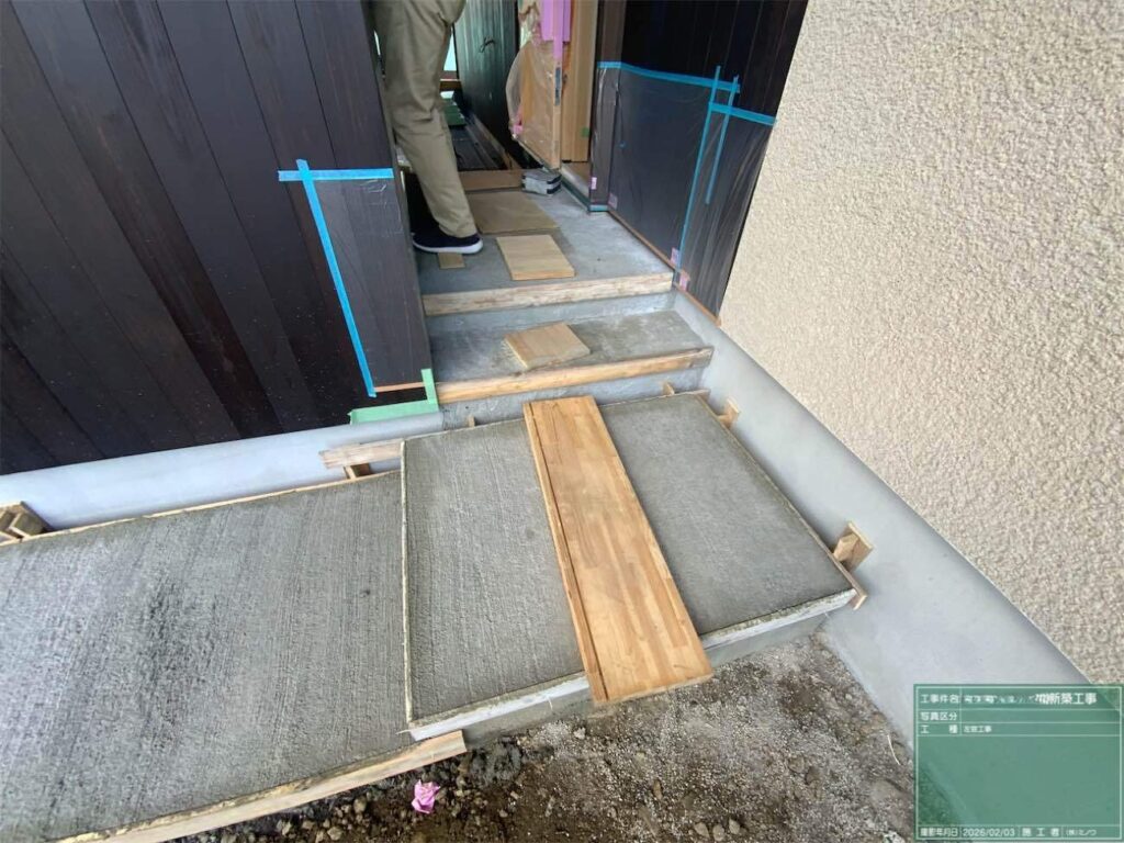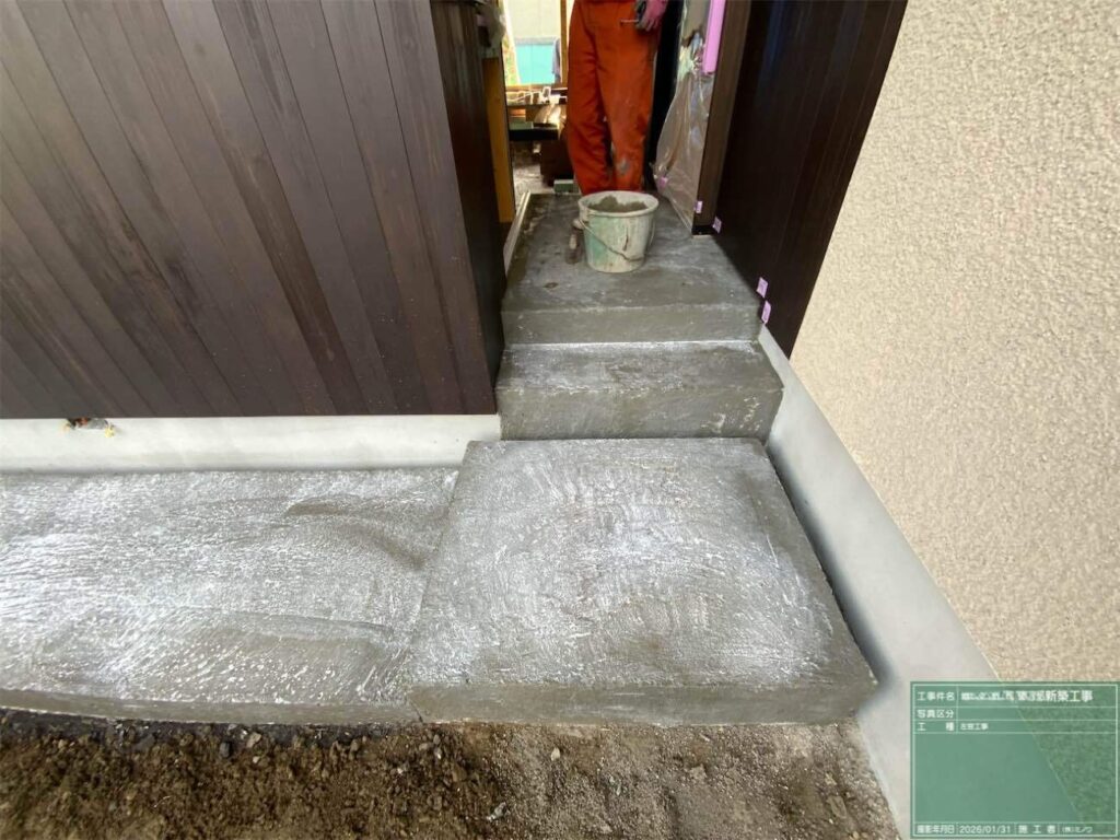 外部はアプローチ部分の土間の左官工事の真っ最中です。非常に冷える気候の中作業してもらっていますのでモルタルが乾くのにも時間がかかり職人さんにもご苦労を掛けています。