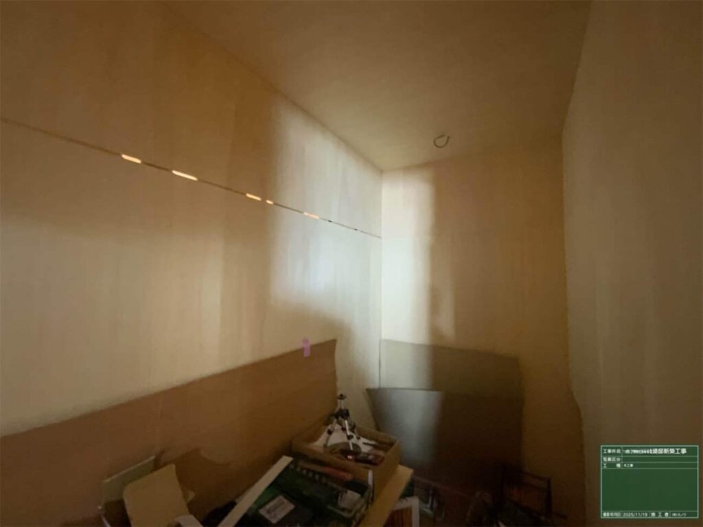 ダイニング上部は吹き抜けとなっています。内装の漆喰塗を行うために建てられていた内部足場が仕上工事の終了に伴い撤去され、その全貌が現れました。解放感ばっちりの吹き抜けの壁にはランダムに棚板のような部材が取り付けられています。これらはキャットウォークとして1、2階間を猫が歩いて上り下りできる通路となります。
