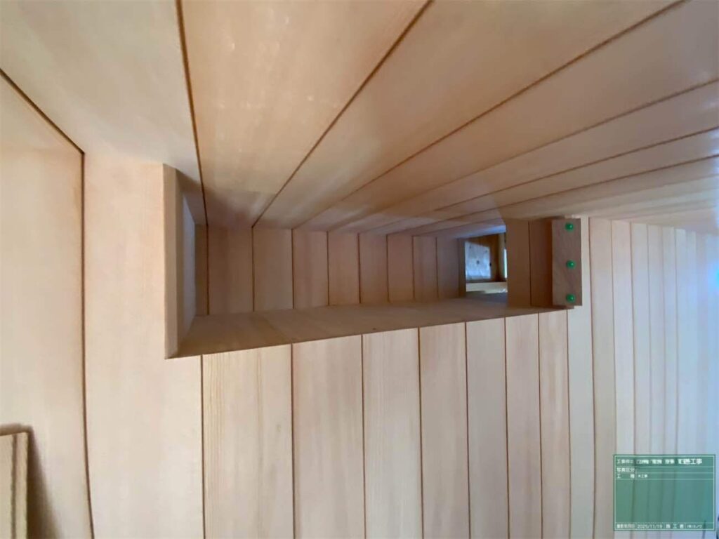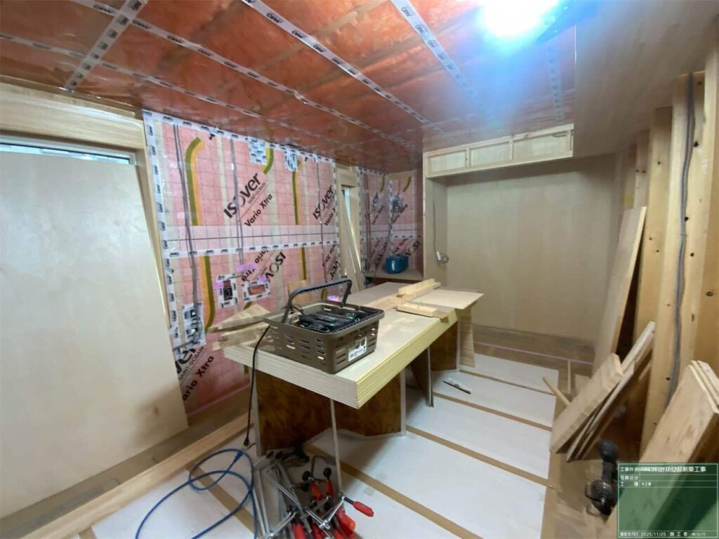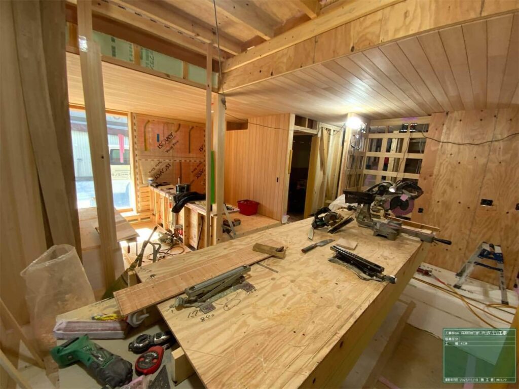 一部外壁の羽目板が敷設されています。これらは2か月ほど前、km様とm井先生がミノワ本社の倉庫まで遠路出向き、DIY塗装したものです。2か月の間倉庫で保管されていましたがやっと出番を迎えました。天井の生成りの木材の色に濃い色の羽目板のコントラストが際立ちます。