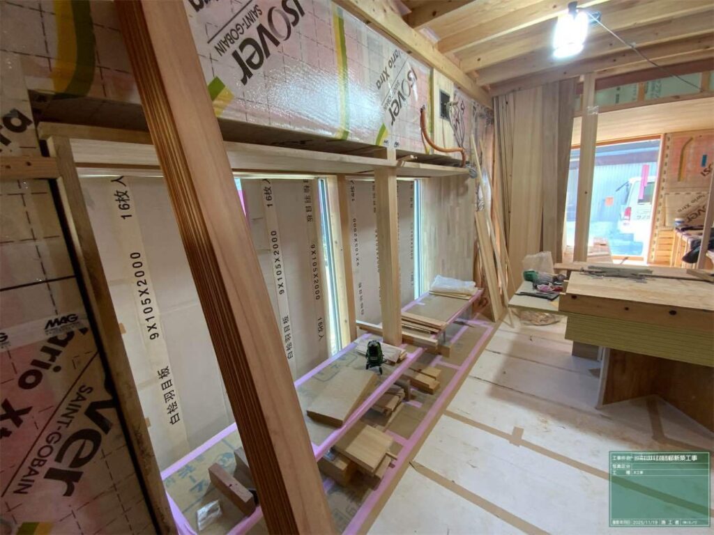 サッシを取り付けられるまでの間には内部で柱間充填断熱に勤しむI井棟梁。いろいろと細かい収まりを考えながら進めるので普段より時間はかかります。