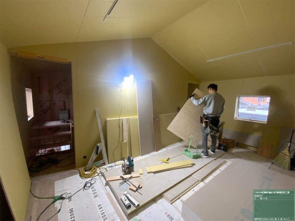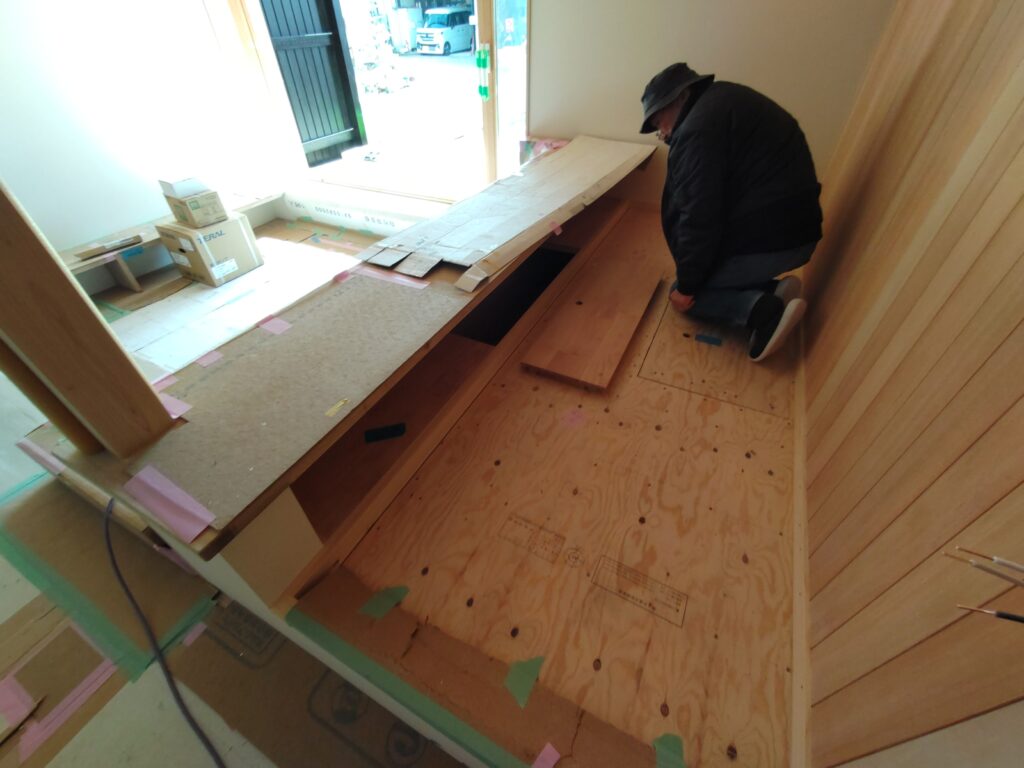 屋内の造作はフローリング張りの段階に入ってきました。使用しているのは西南桜のシルキー塗装品。サラッとした表面の仕上がりが特徴です。
