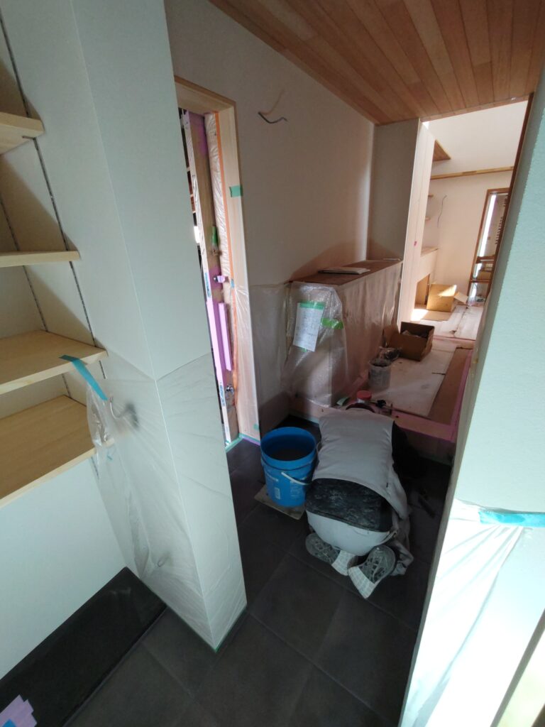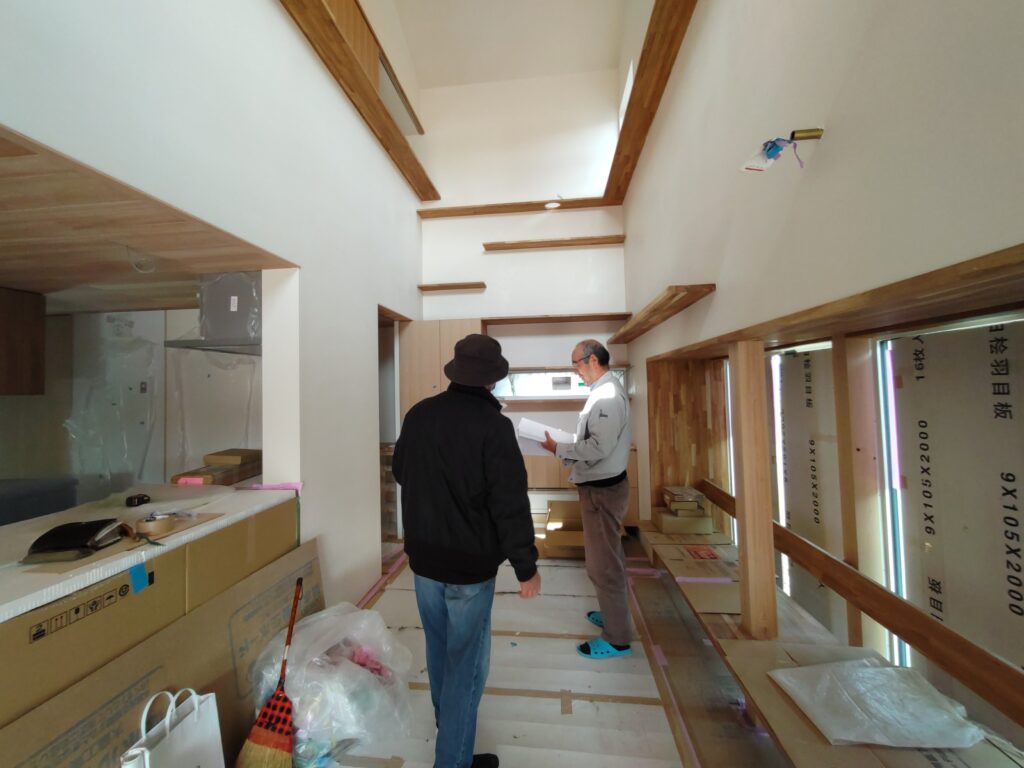 本日、完了検査を受審しました。検査員は一定の検査終えた後、m井先生と各所の収まりや仕上に関して興味津々で談笑、半分検査そっちのけで盛り上がっていたとか。筆者もだいぶ久しぶりに直接現場を訪れるため、できあがってきている現場の内外装に非常に感動を覚えました。