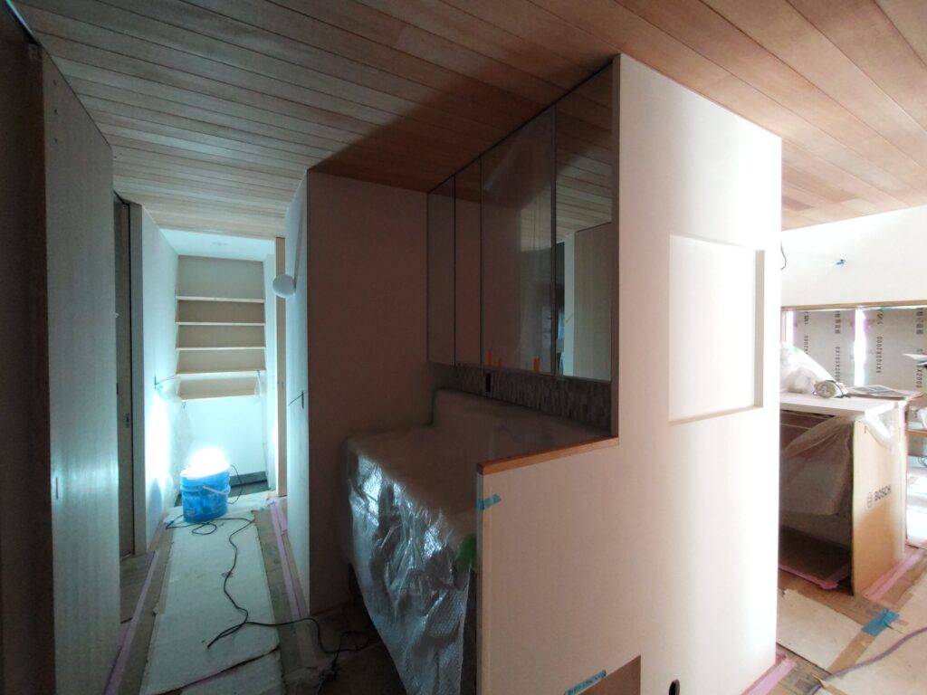 各箇所の造作工事も終了しています。全体像ができあがってくると、m井先生乾坤一擲のこだわりディテールがあちこちに見られます。以前別件で体感しましたが、平面・立体プランの中で如何にムダ無く隅々まで空間を使い切るか、という事に心血を注ぐ先生だなと感じます。