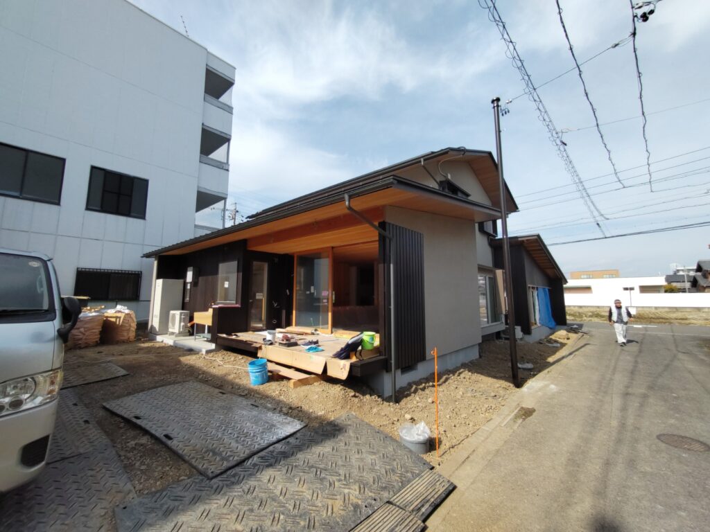 濃い色の外壁が張られてくるとファサードの表情が変わったように感じます。濃い外壁と、比較的明るい色の木製サッシ、軒天井板とのコントラストがくっきりと表れています。