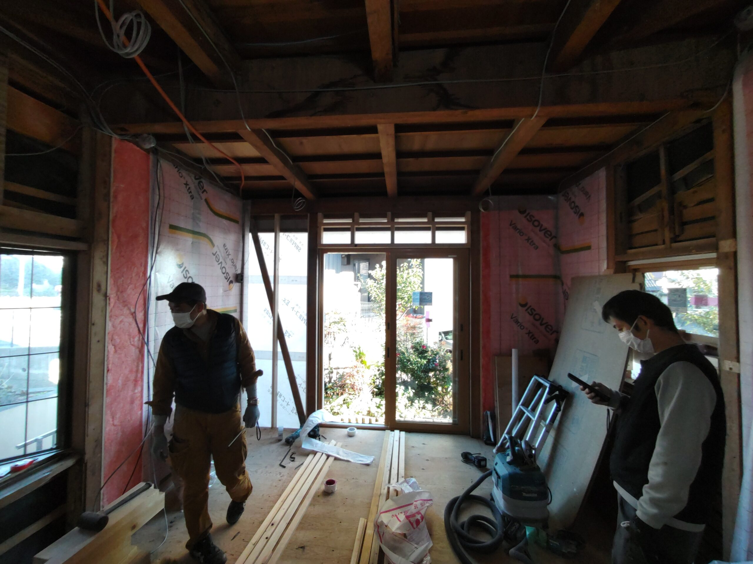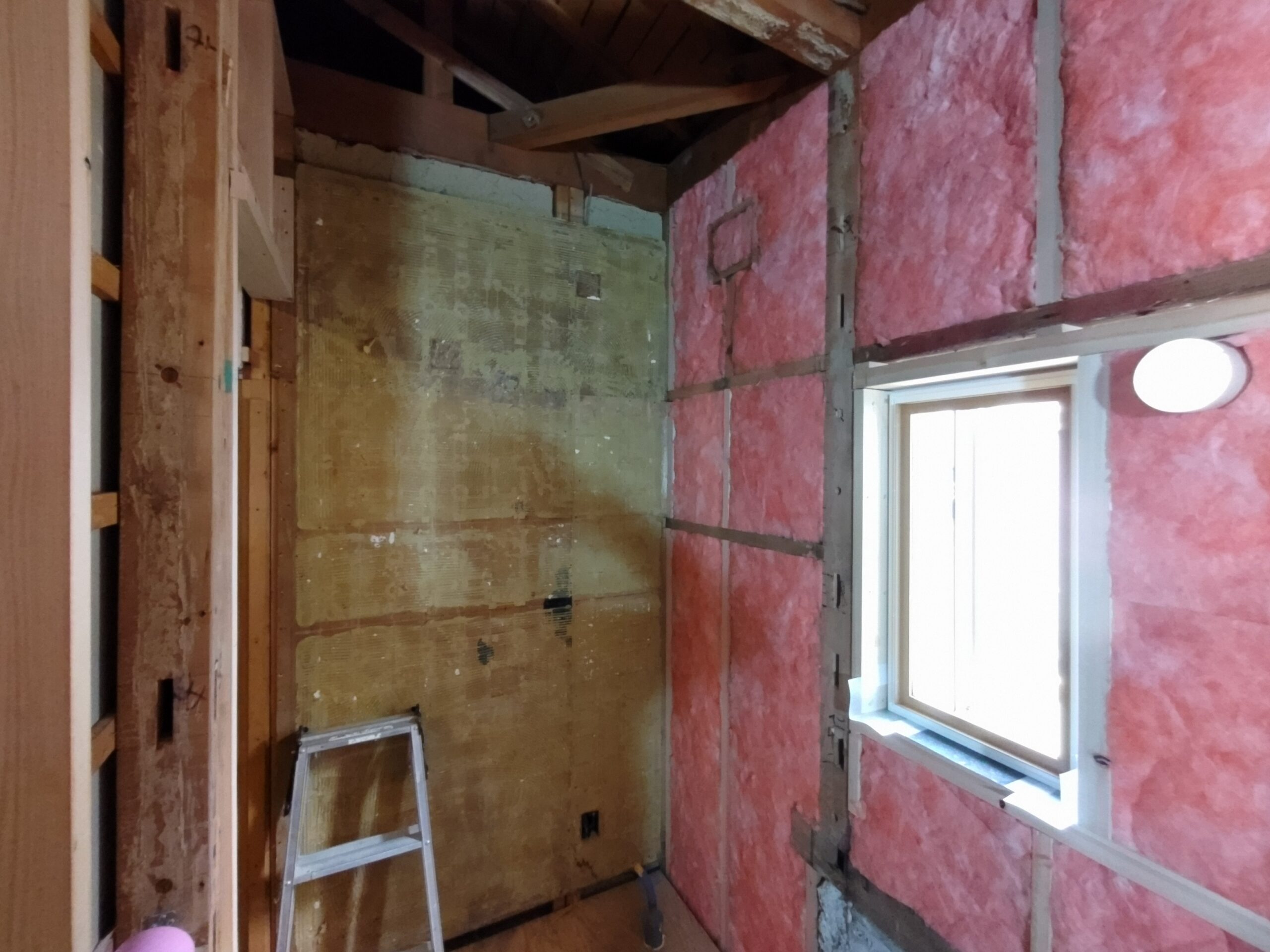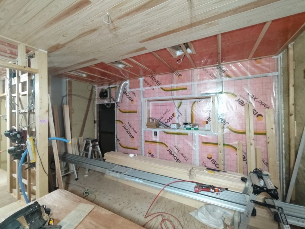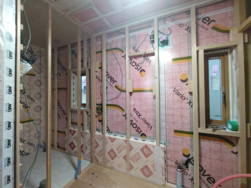 造作工事は二人で行っているために進むスピードが非常に早いです。外壁の断熱充填はほぼ完了していますが、既存の在来浴室であった部分はコンクリート基礎が立ち上げてあったため、その部分も断熱するべく壁を少し付加して(フカして→厚みを増して)内側にボード系断熱材を貼ることで対処しています。