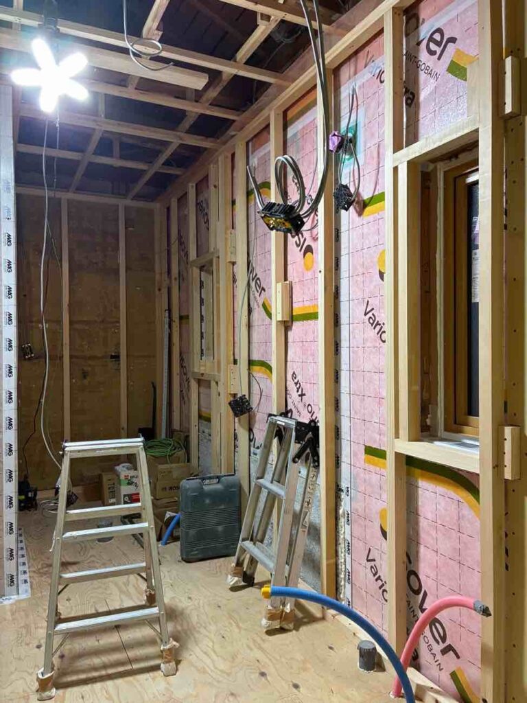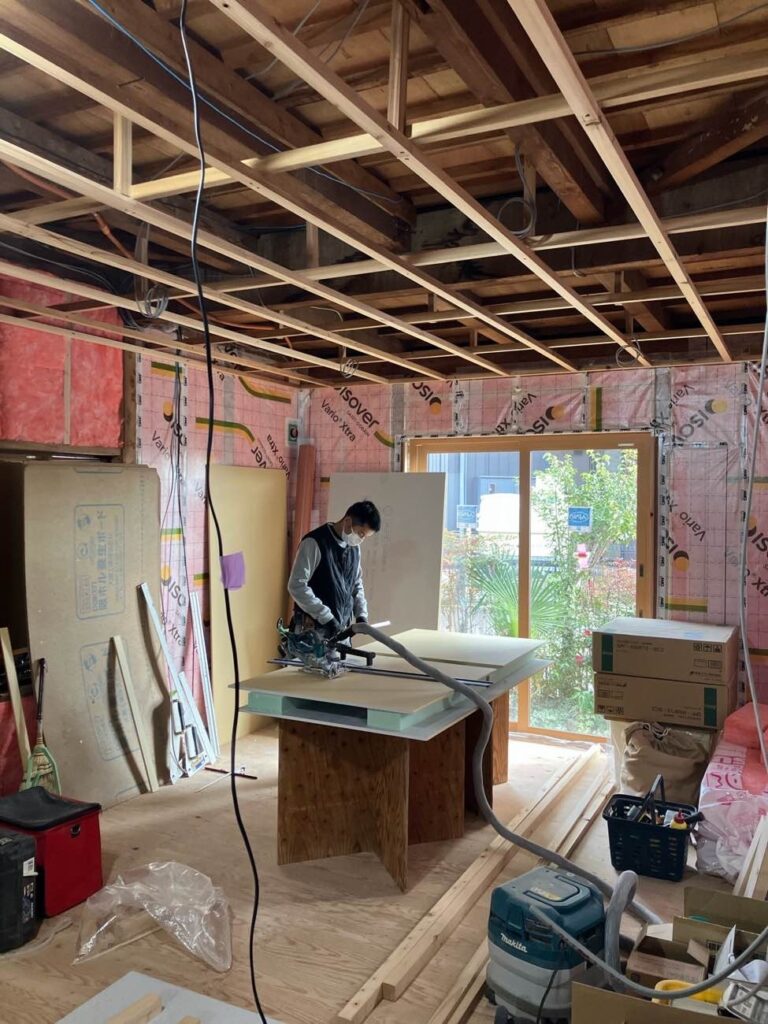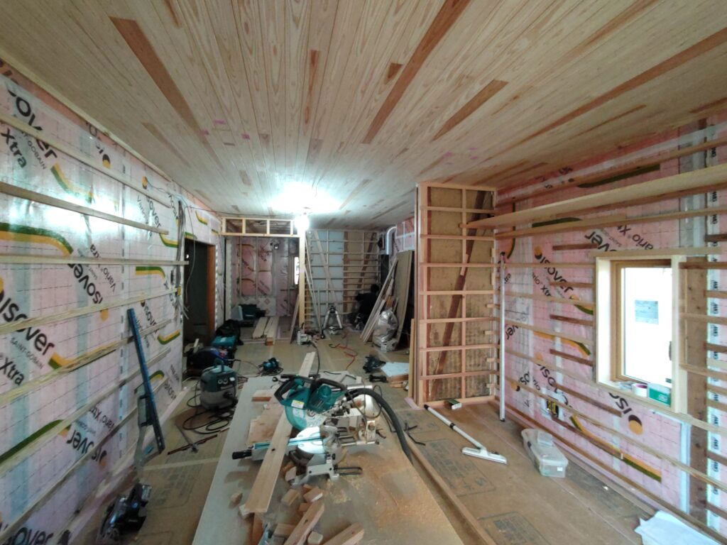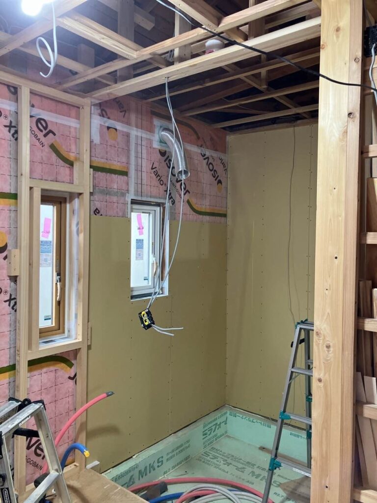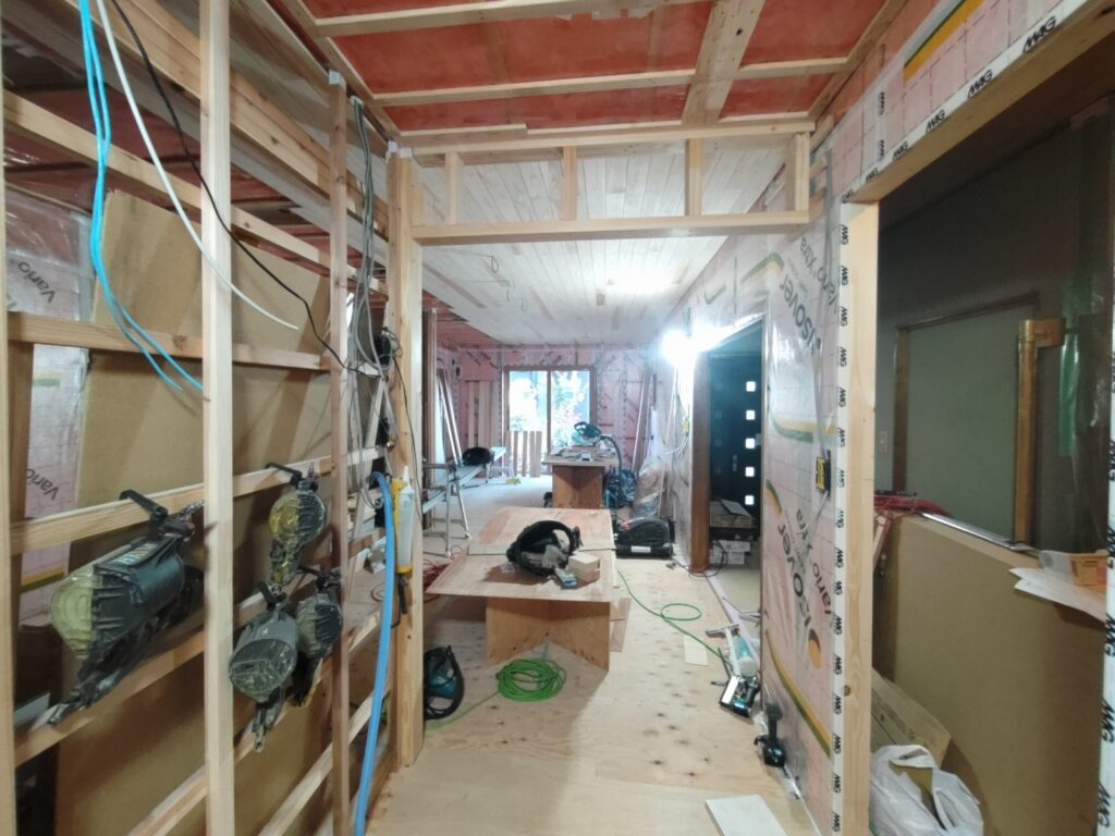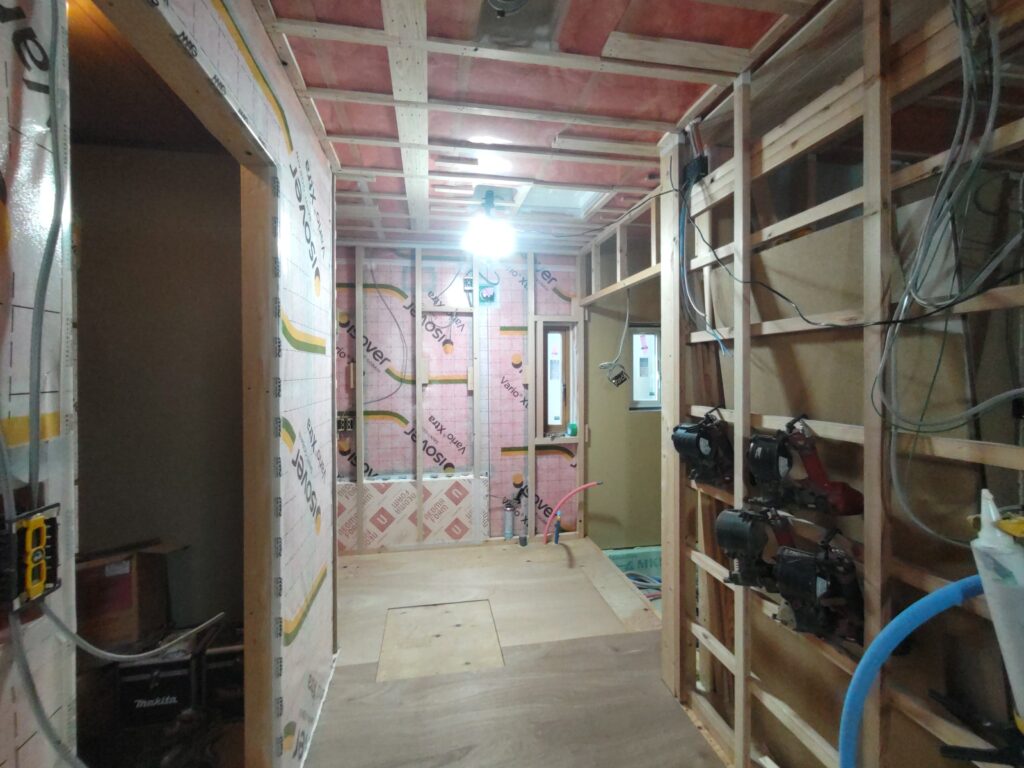 内装間仕切ができてきています。今週は天気予報によれば大寒波が到来との事、本日も比較的寒いですが、さすがに断熱材を充填した現場内は暖かです。
