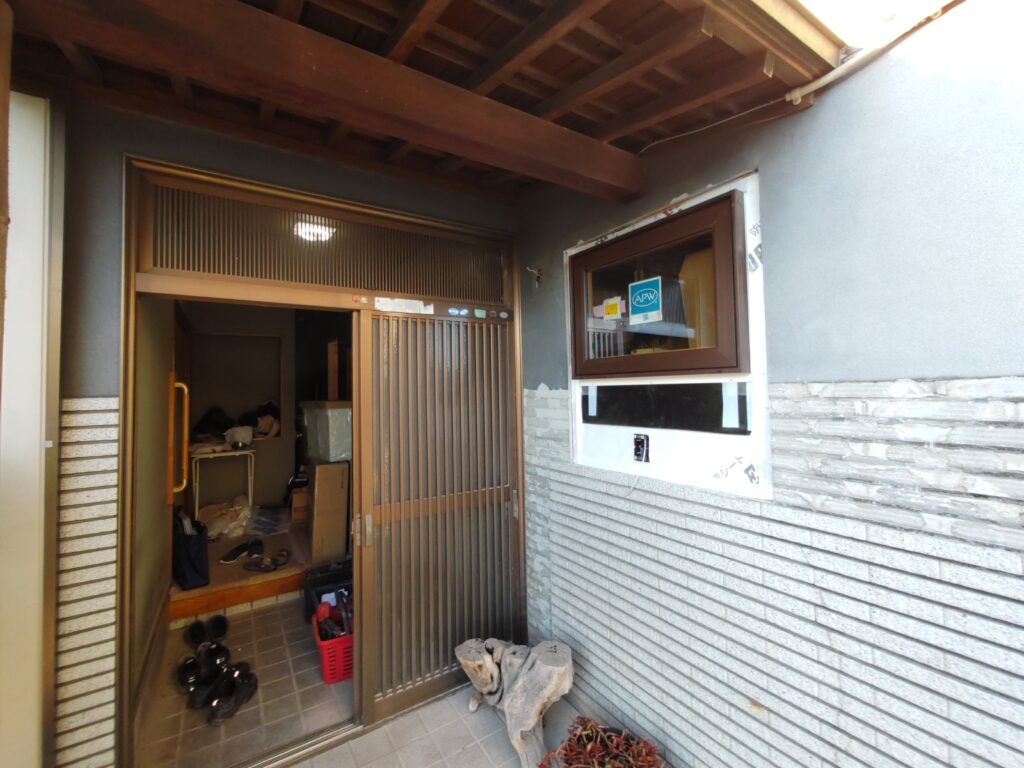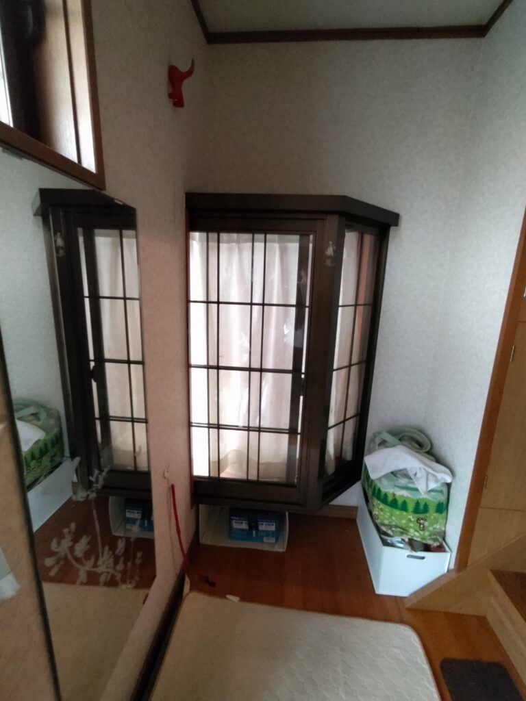 改装する部屋に面するサッシも樹脂サッシに取替。壁は断熱材で強化できるのですが、こういった開口部は断熱気密工法にとって一番弱点となる場所です。熱伝導率の低い樹脂サッシに取り換える事で屋内の熱を外に逃がさないという温熱環境の改良を加える事ができます。