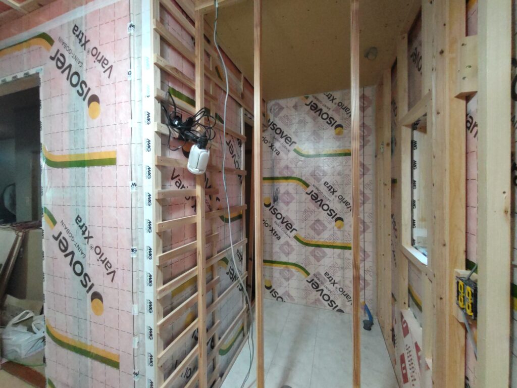 外部に面する壁のうち、もともと浴室の基礎立ち上がりがあった部分は柱間断熱充填できないので、内側にボード系断熱材を貼り付けます。内装壁に段差ができないように断熱の厚みの分だけ部屋の壁をフカします。(なんとなく空間がもったいなくもありますが・・。