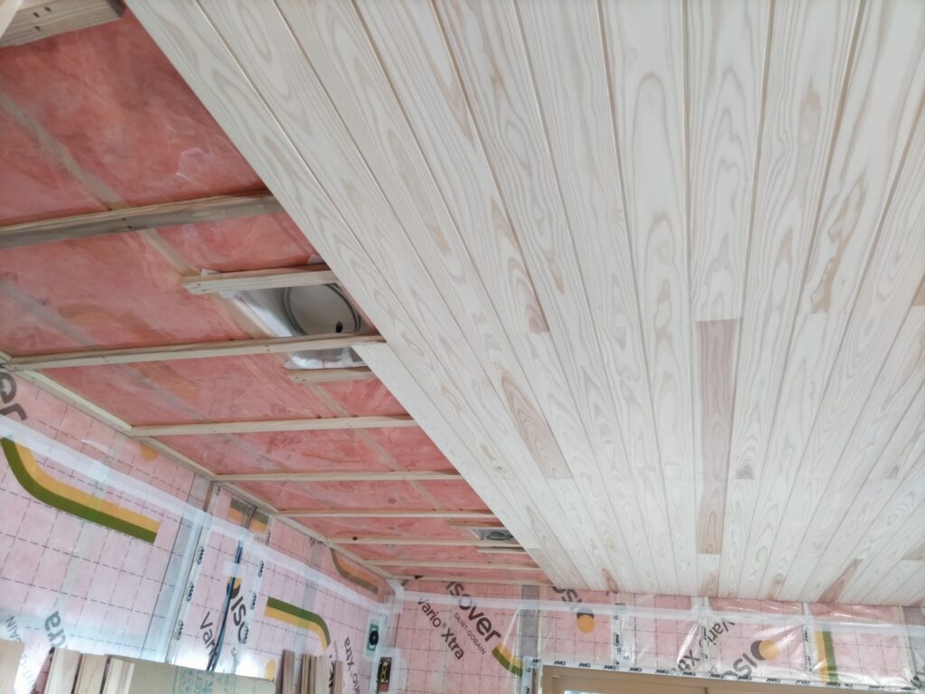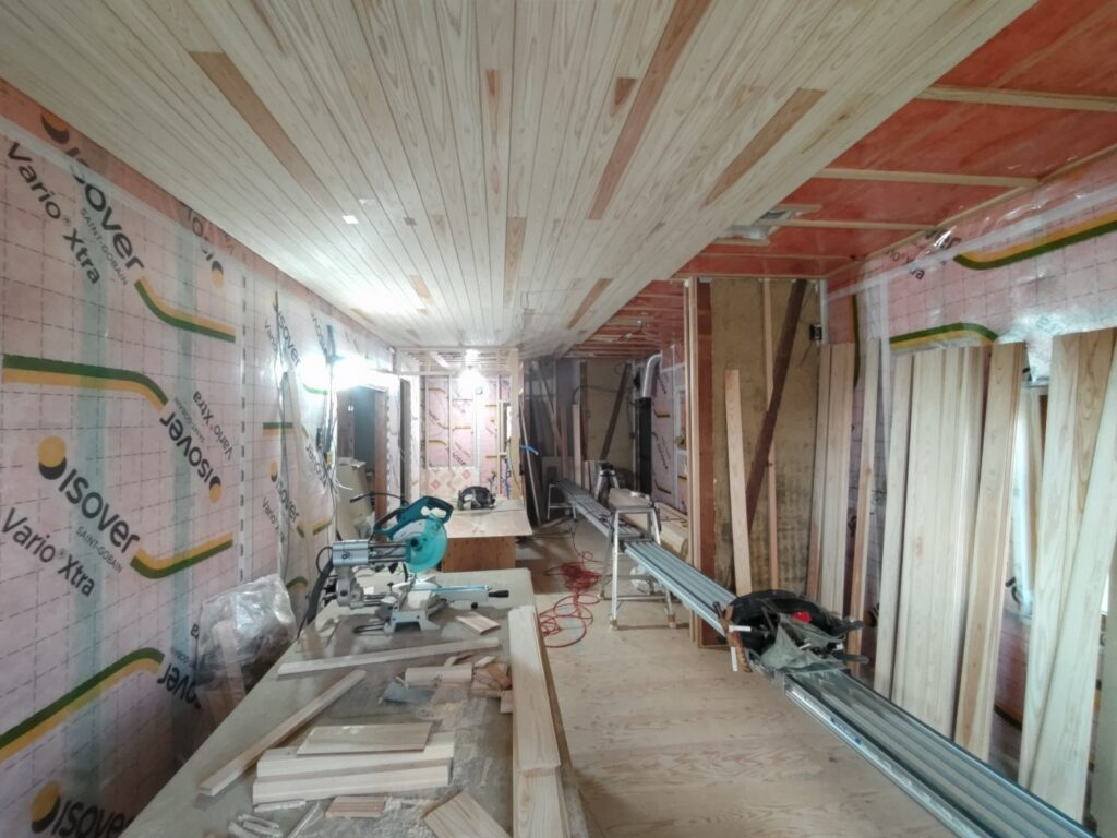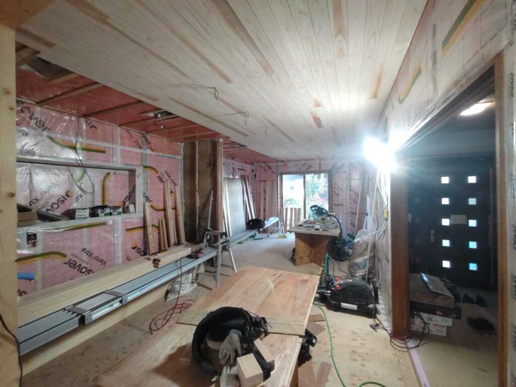 メインのLDKの天井には杉の羽目板を張っていきます。以前の居間、台所は天井、壁ともクロス貼でしたので、改装後は木材の肌理が活かされた空間となります。居間と台所の間にあった間仕切も撤去して一室としましたので羽目板の目地による長手方向の奥行き感が強調されます。
