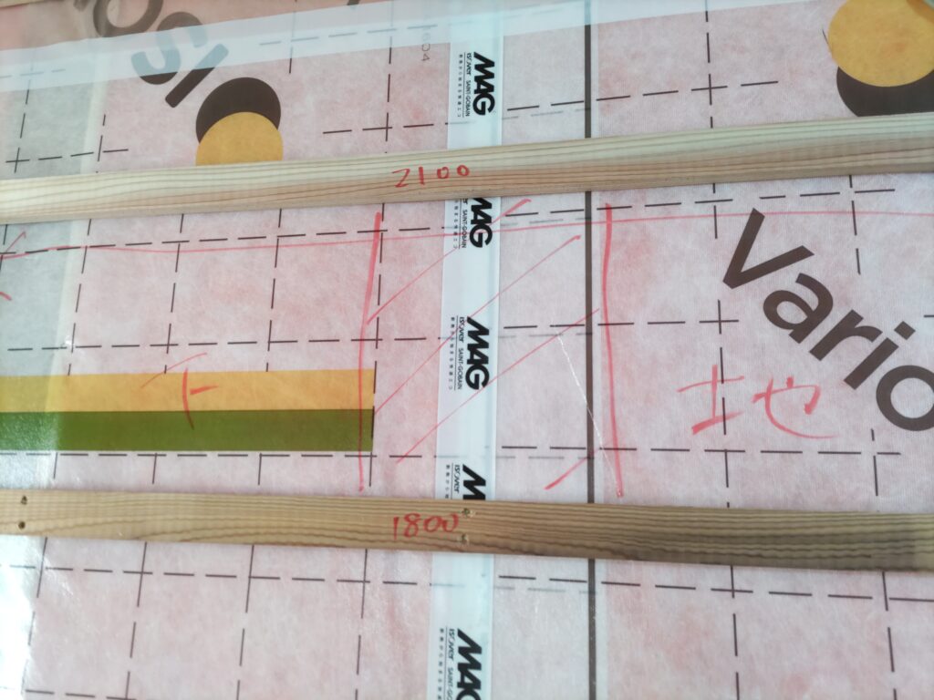 下地材を運搬してきました。これら下地材を保管しておく場所も限られているのでできるだけ効率よく置きたいところです。4mの長さの材料を振り回さないよう慎重に運搬している監督のO本君です。