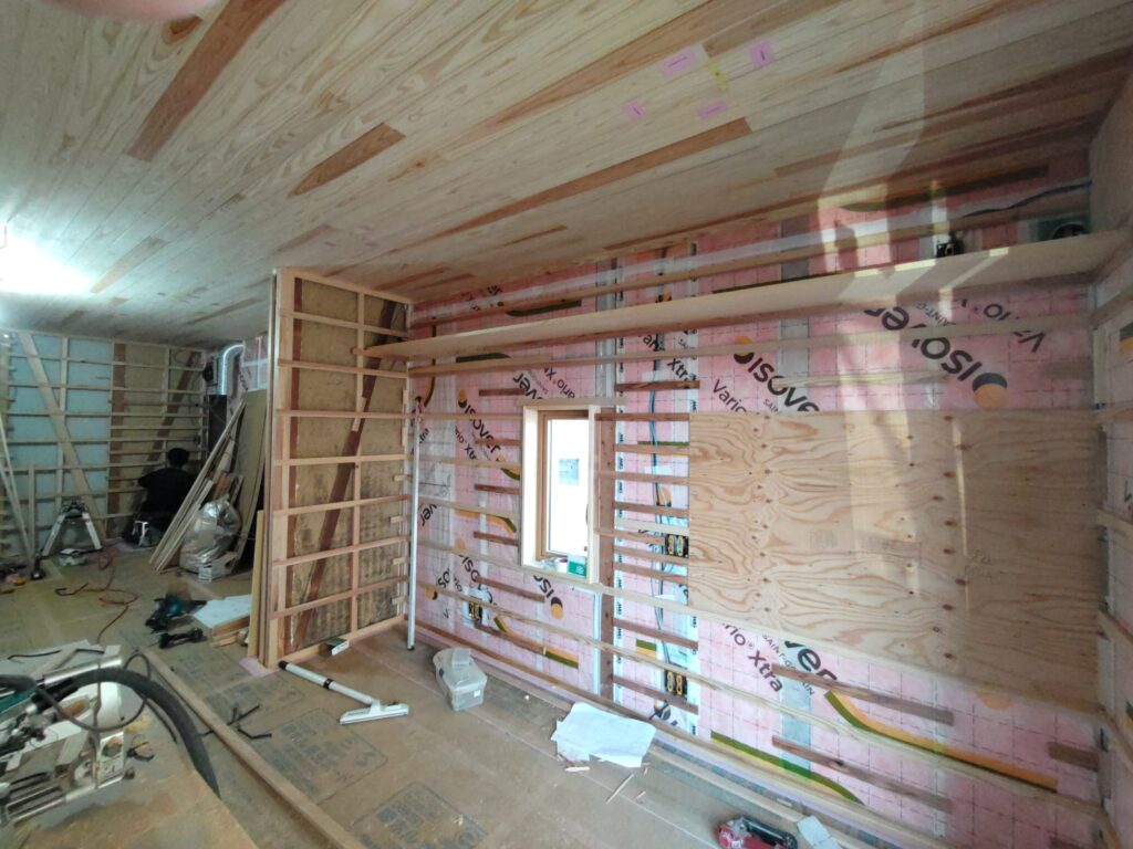 内装下地工事が進んでいます。壁の石こうボードを張っていく際にビス留めをするための下地位置に細い材料を渡すのみならず、壁掛けテレビや絵画などを飾りたい場所にあらかじめ下地を入れておきます。