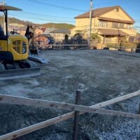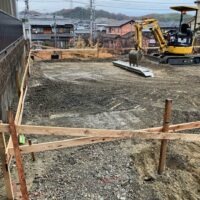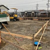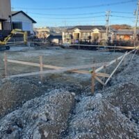丁張りを行い、地ならしを行っている様子です。北下がりの高低差がある土地ですが、北側の見晴らしが良いところが気に入られ土地を購入されたそうです。見晴らしを楽しむため、対面キッチンではなく壁付けキッチンにされて景観を楽しまれるとの事。家族の様子やTVを観ながら料理できる対面キッチンは人気ですが、窓に面した明るく眺めの良いキッチンで料理をするもの癒されそうでいいですね、出来上がりが楽しみです。