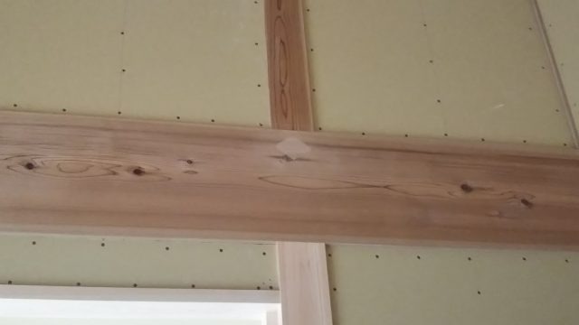 クロス屋さんがパテ埋めをしています。クロスを貼った後凹凸が出ないよう、くぎを打ったところを一か所づつ丁寧に埋めていきます。