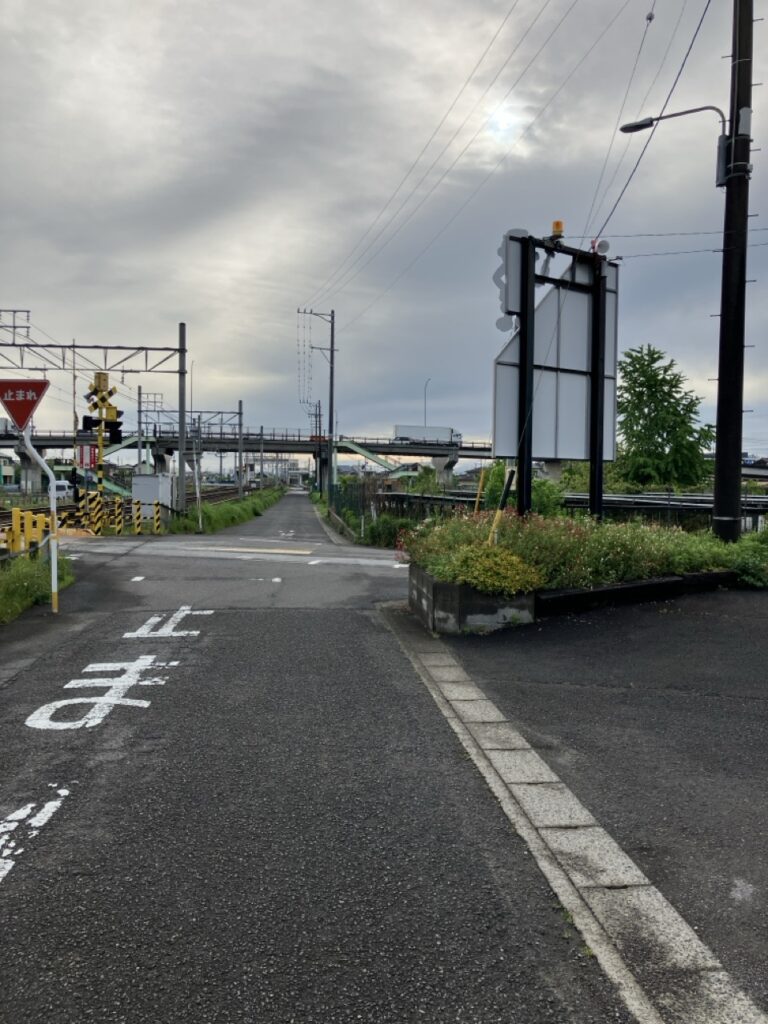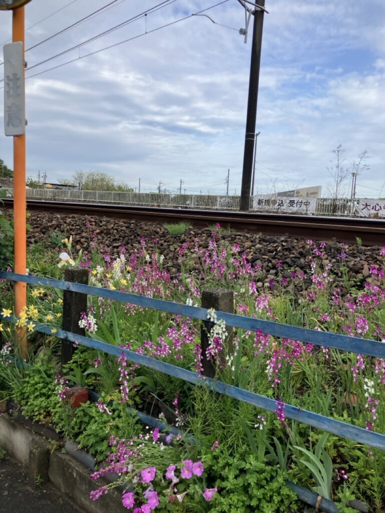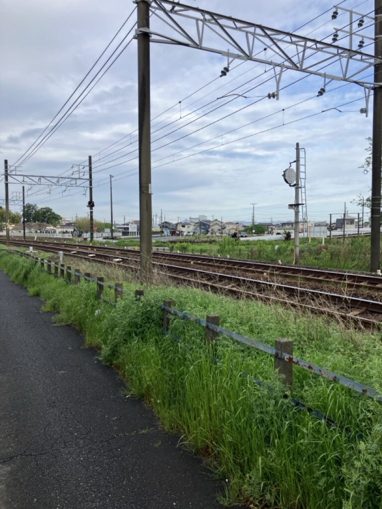 前日の雨の雲がまだ残っているような曇天です。春になってきたので線路沿いの雑草も結構伸びてきました。梅雨前後に名鉄によって刈られるものと思います。