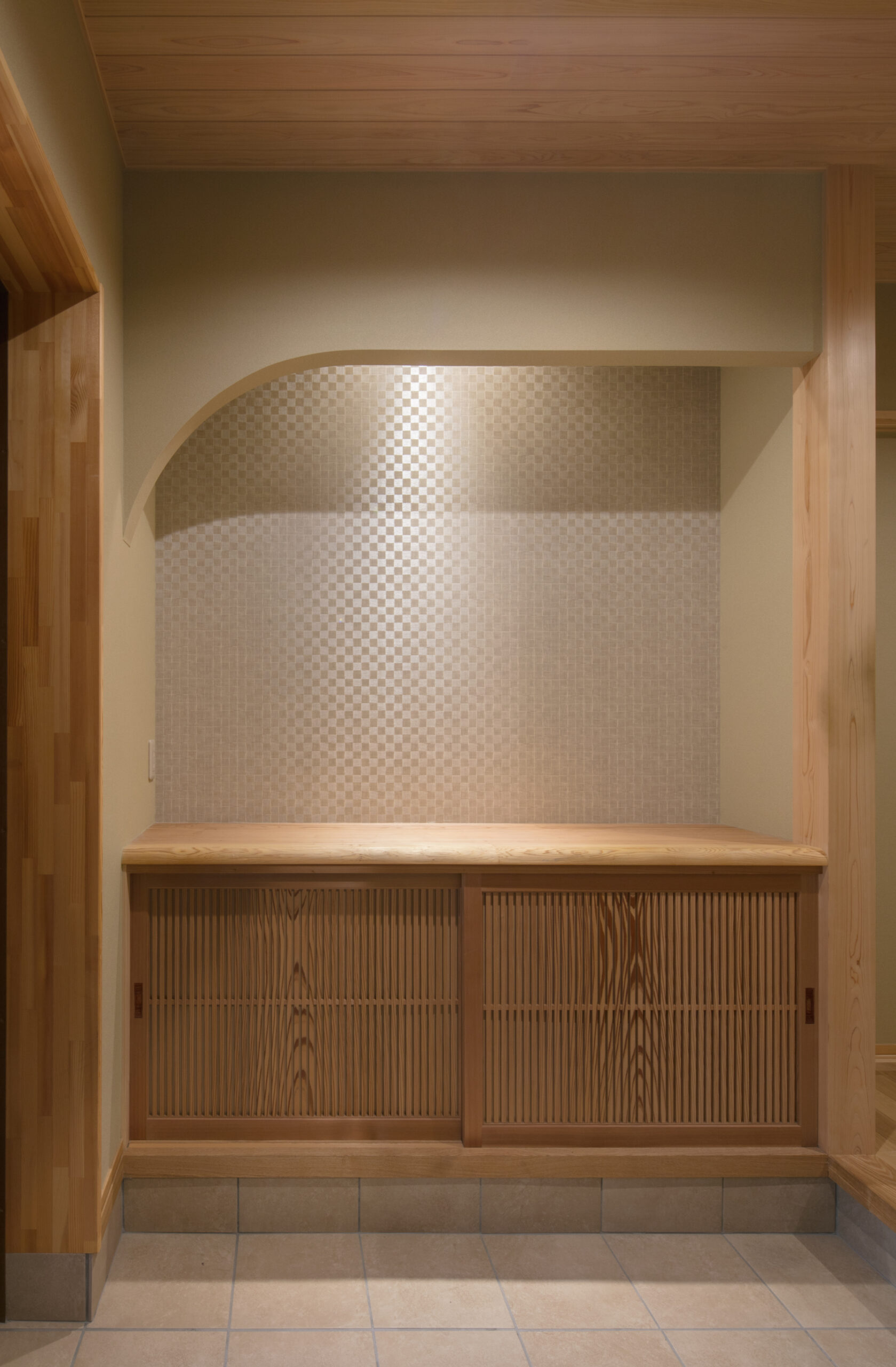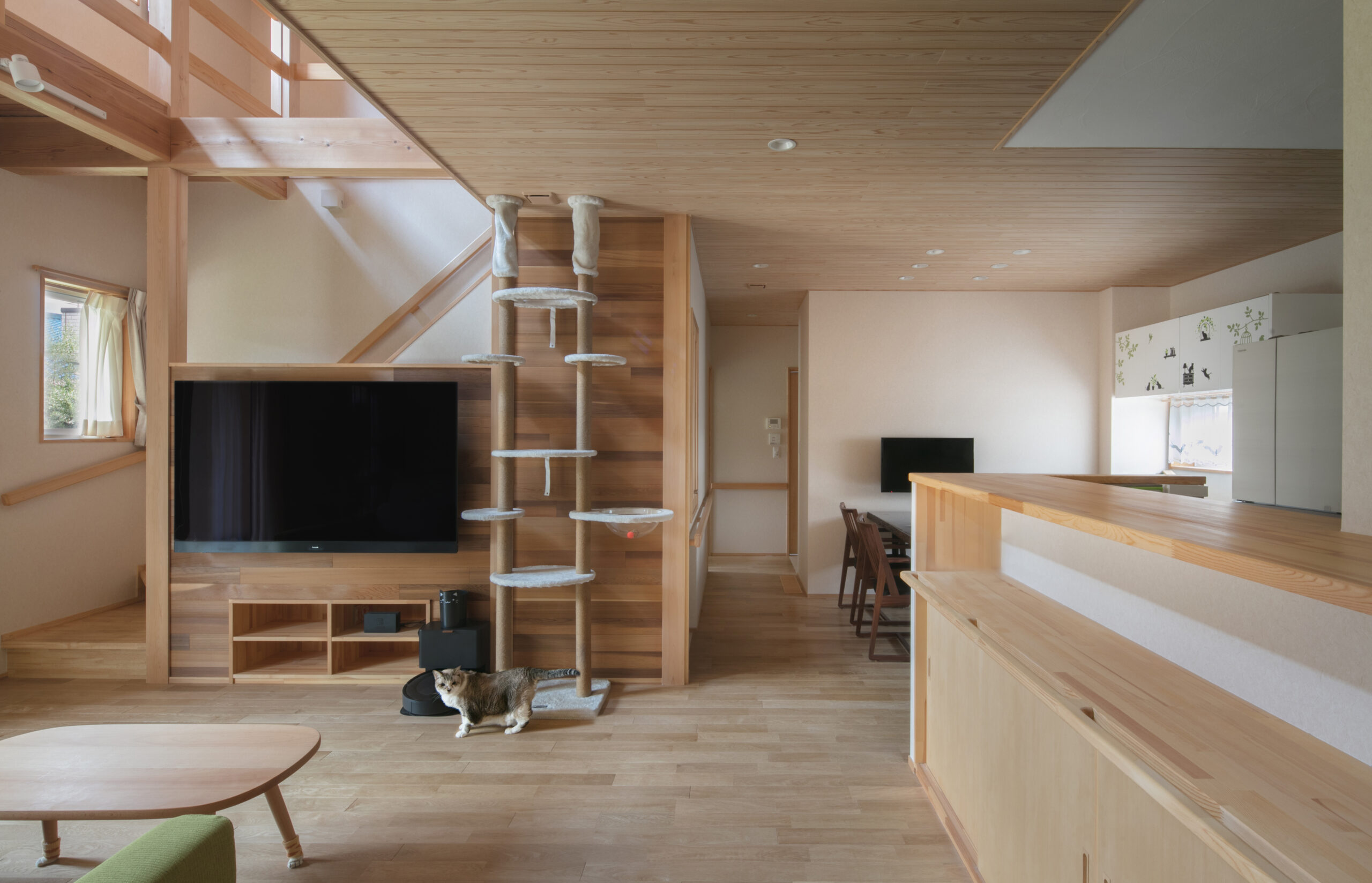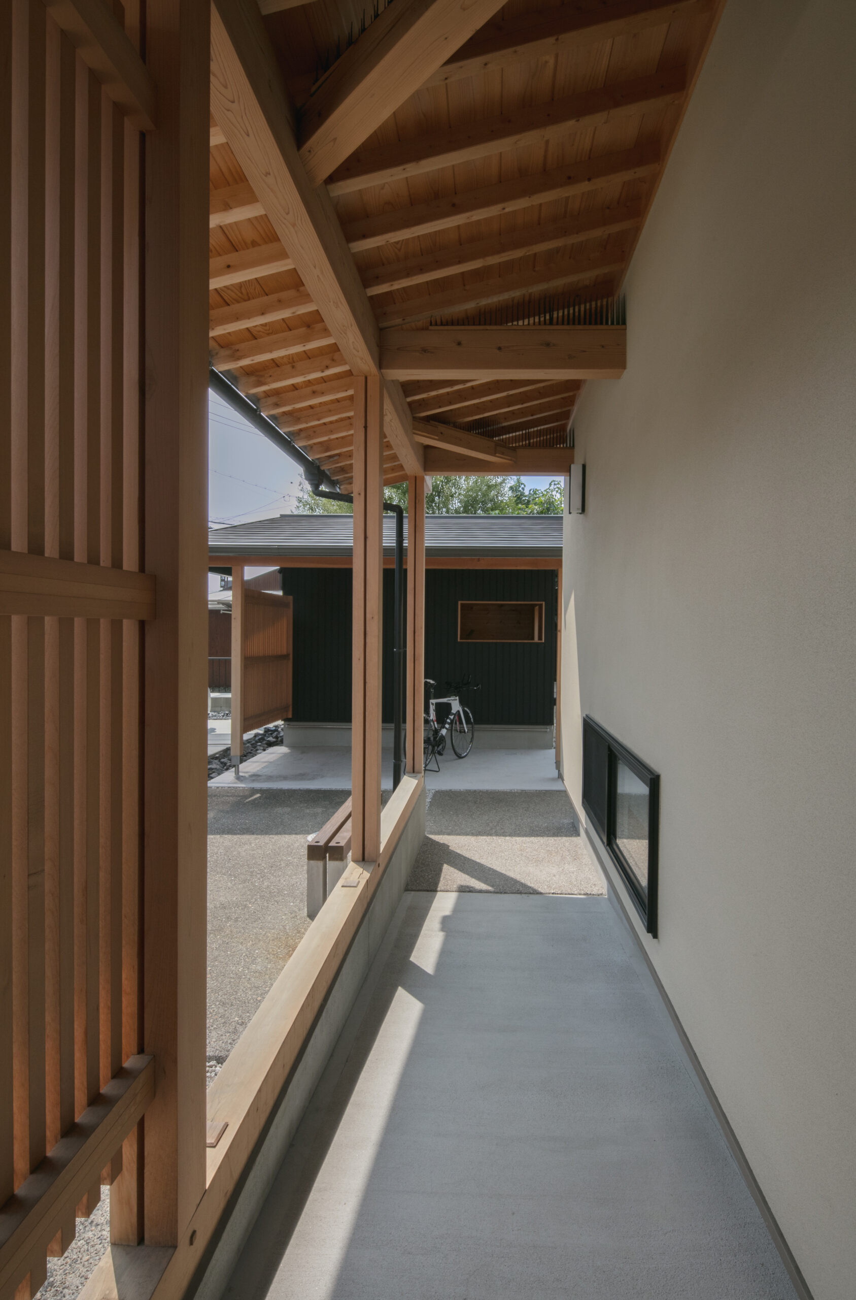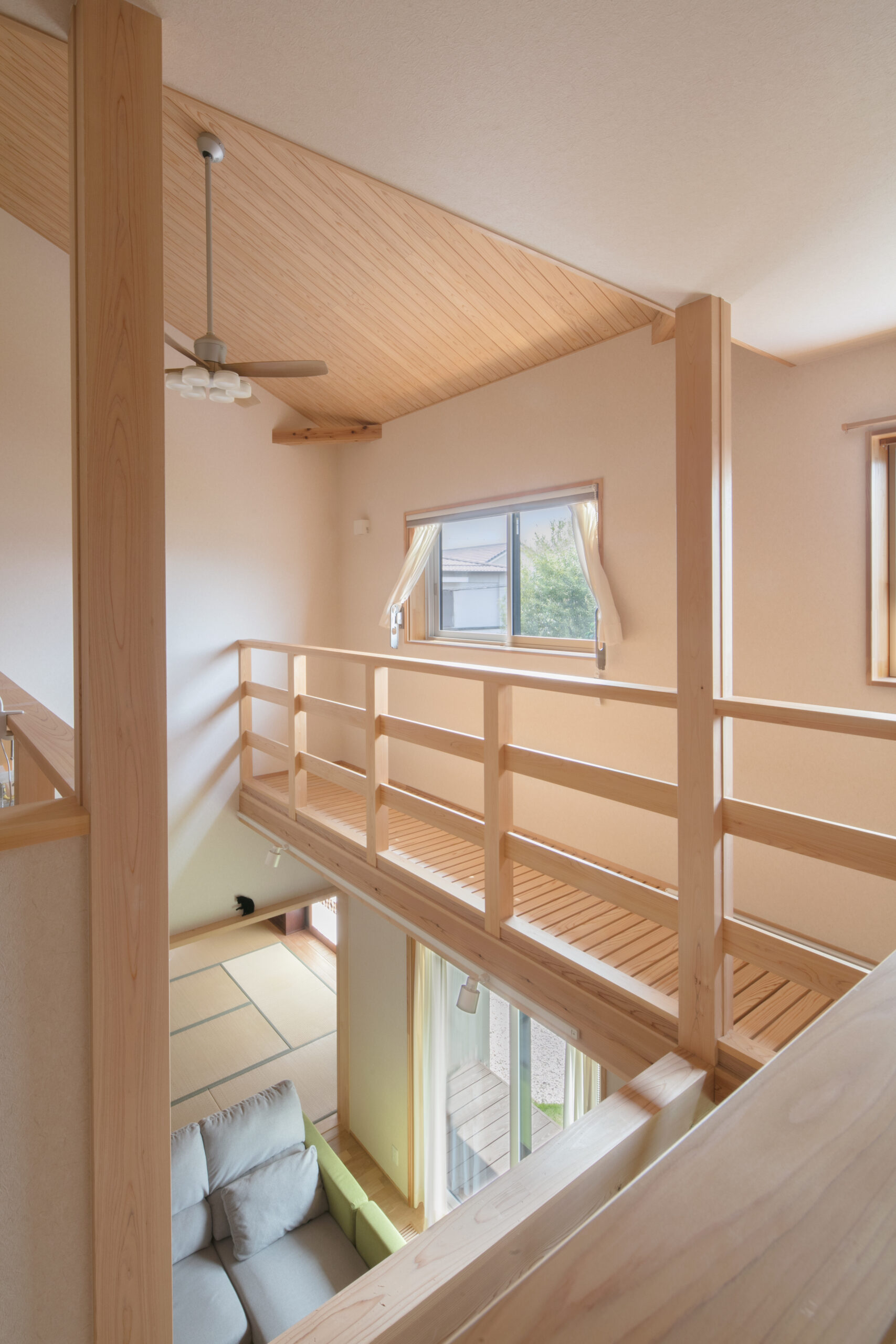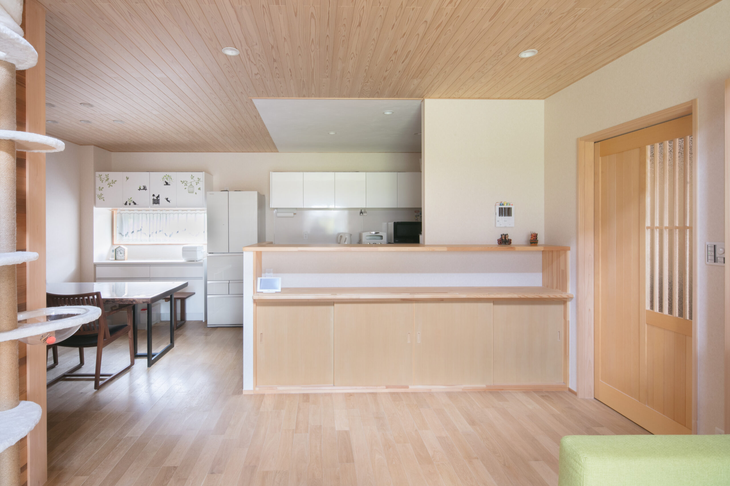 【延床面積】175.45㎡(53.06坪)/【工法】木造軸組工法/【断熱】基礎内:押出法ポリスチレンフォーム 外壁:高性能グラスウール(大壁) +付加断熱高性能グラスウール 屋根:平天井:高性能グラスウール・勾配天井:セルロースファイバー/【換気】第1種換気【屋根・外壁】屋根:平板瓦葺き 外壁:弾性リシン吹付・ガルバリウム鋼板【開口部】樹脂サッシ【内装】床:ナラ材・杉材 壁:エコクロス 天井:桧羽目板・エコクロス【UA値】0.32【ηA値】0.8【C値】0.5