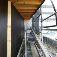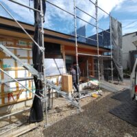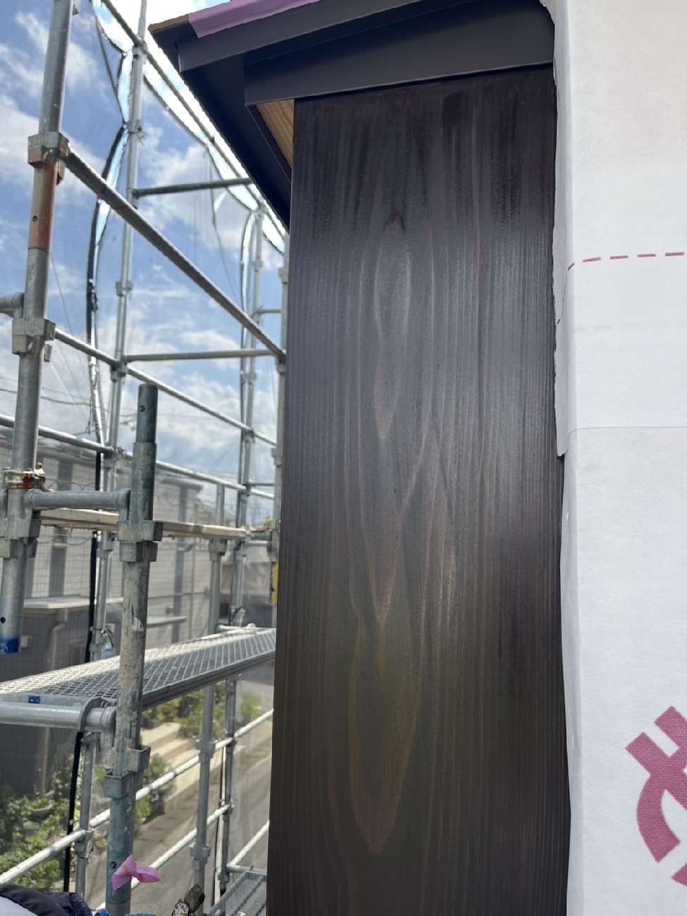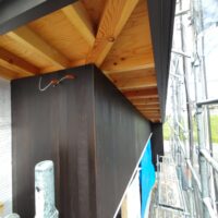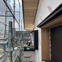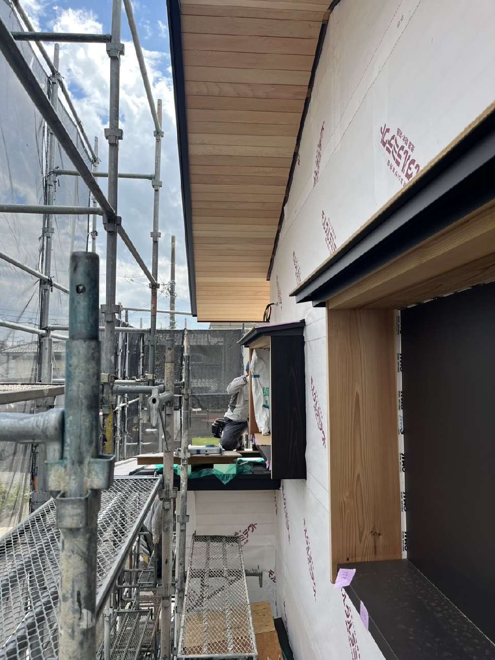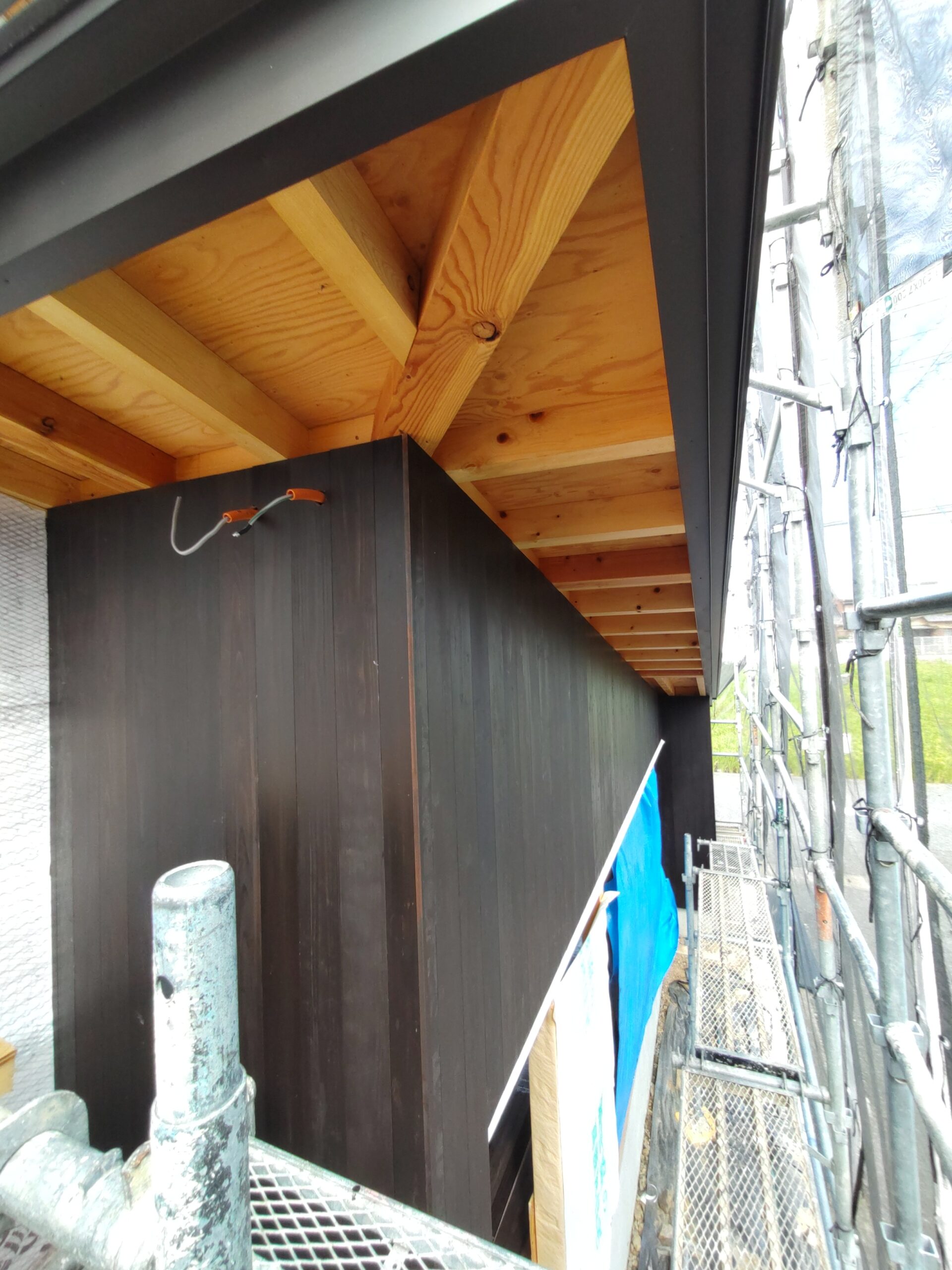 その他、外部の庇等の部分は塗装のh屋さんが作業にかかっています。こちらの外壁も明るい色になる予定。ワンポイントの濃い色がアクセントになります。