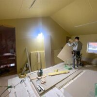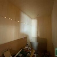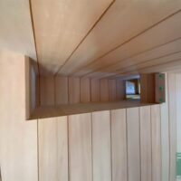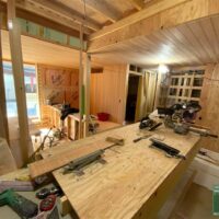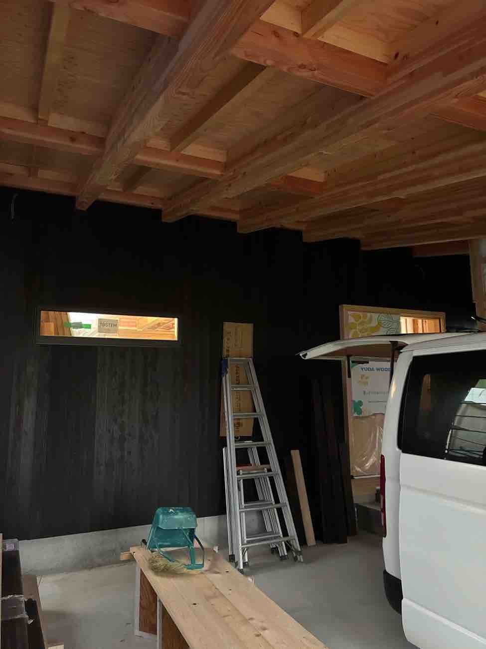 一部外壁の羽目板が敷設されています。これらは2か月ほど前、km様とm井先生がミノワ本社の倉庫まで遠路出向き、DIY塗装したものです。2か月の間倉庫で保管されていましたがやっと出番を迎えました。天井の生成りの木材の色に濃い色の羽目板のコントラストが際立ちます。