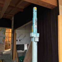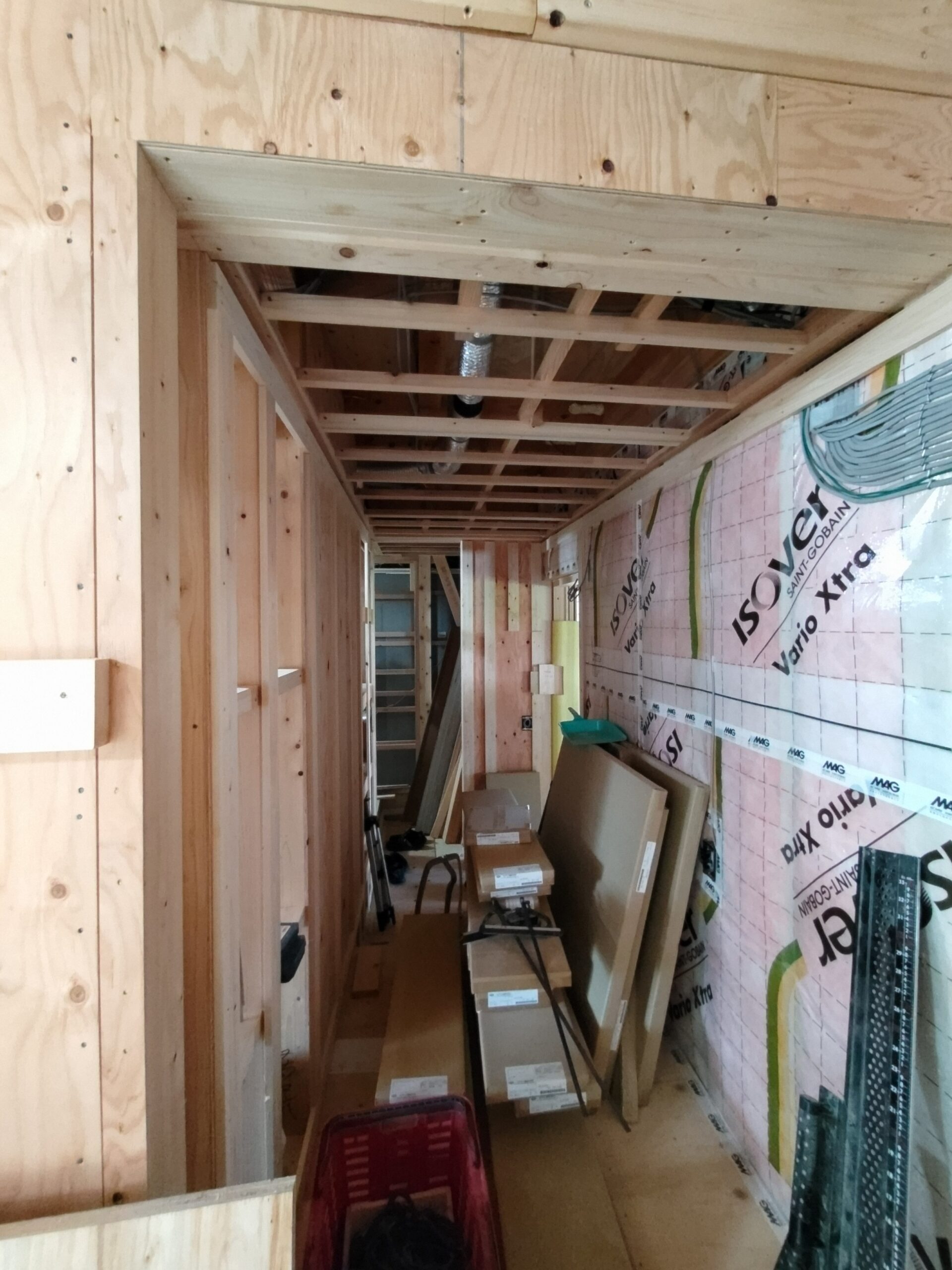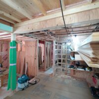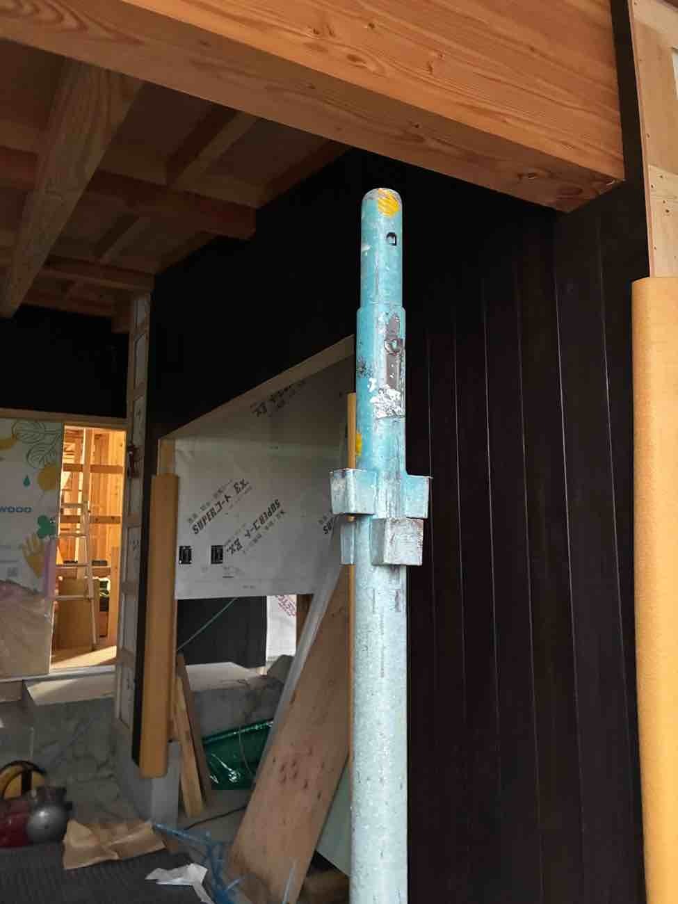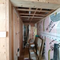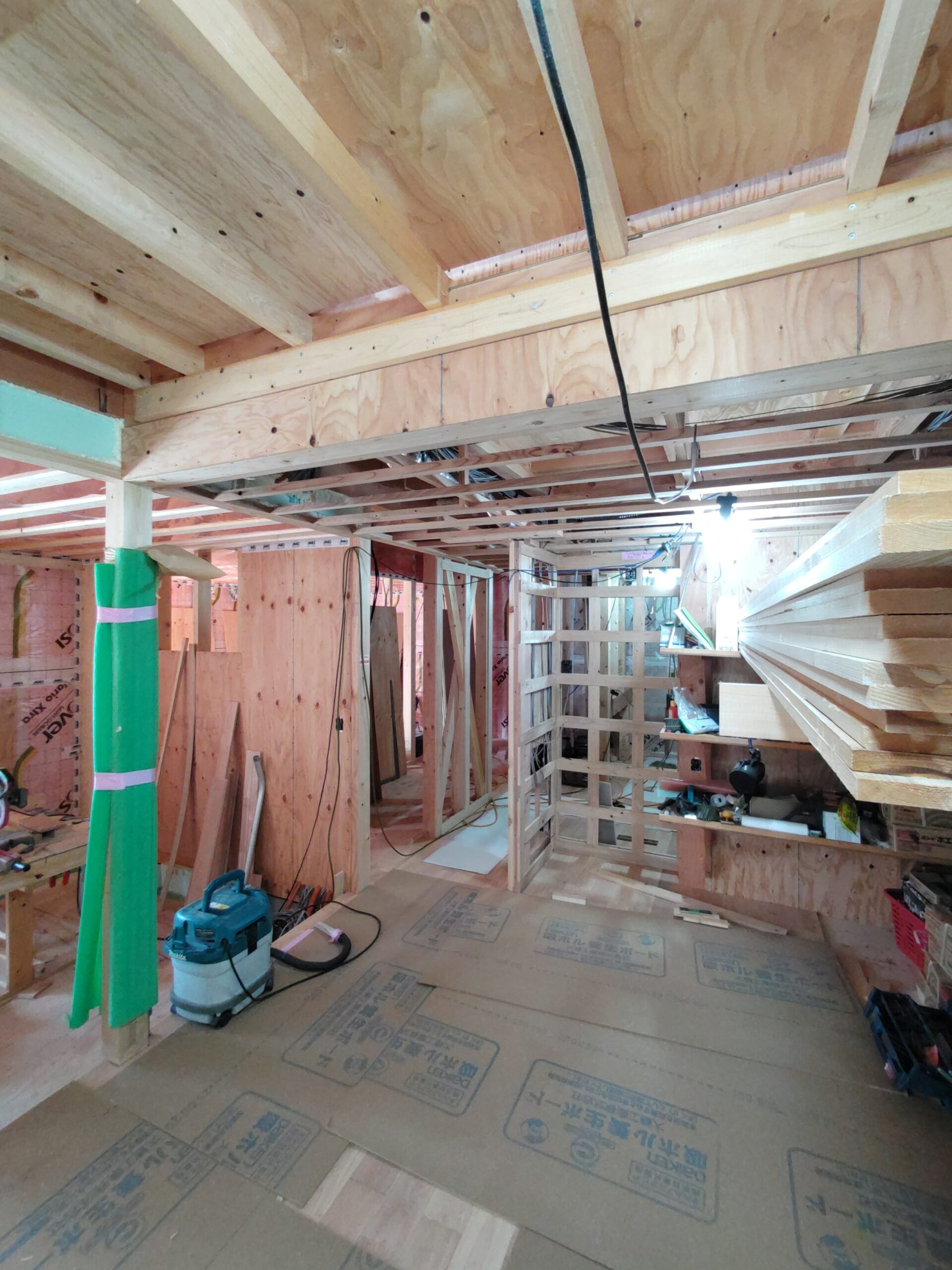 棟梁は外装下地に精を出しているため、内装は構造の検査を受けた直後の状態です。今回は構造計算により、屋内にも耐力壁が散見されています。