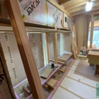 サッシを取り付けられるまでの間には内部で柱間充填断熱に勤しむI井棟梁。いろいろと細かい収まりを考えながら進めるので普段より時間はかかります。