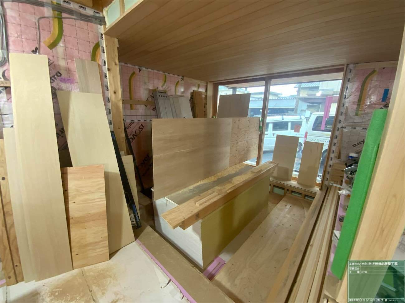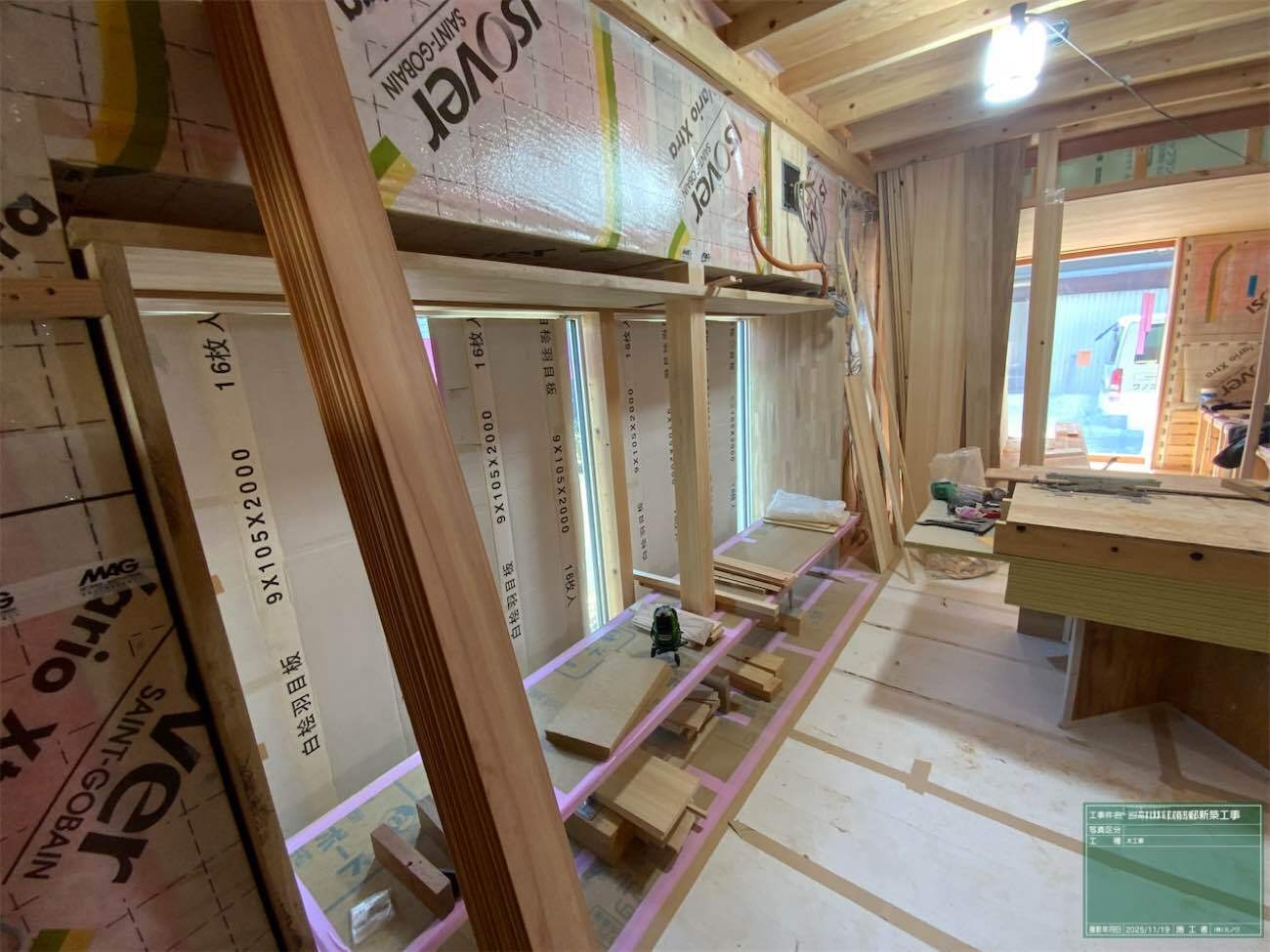 内部では造作工事、内装下地工事の追い込み真っ最中です。各箇所少々手間がかかるのでh谷川、k保木両大工が応援に駆けつけてくれました。だんだんと形になっていくm井先生の図面の内容。普段のミノワの建て方とは一味違った空間が見られます。
