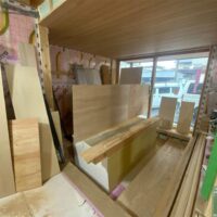 リビングの南面の掃き出し窓は2本引き込みの木製サッシです。アイランドプロファイル社のヘーベシーベ窓を取り付けられました。と、文面ではさもヨカッタヨカッタという風体で書いていますが、設置されるまでが苦労の連続でした。 ㎜単位までオーダーできるため、逆に精密な設計採寸打合せが必要となり、実際に納品され取り付けられるまでは非常に戦々恐々でした。いざ現場に搬入されたらこの窓一枚が重いのなんの。3~4人がかりで持ち上げ、北側道路からは反対の南面まで息も絶え絶えに運ぶことと相成りました。