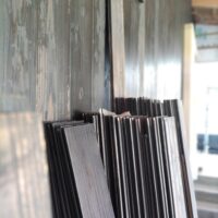 灼熱の鉄板の上で屋根ガルバリウム鋼板葺き工事が行われています。朝夕はまだまだ涼しいものの、もはやこの時期から空調服は必須になってきます。今回は普段ガルバリウム鋼板葺きで使用される『勘合式立平葺き』屋根ではなく『立ハゼ葺き』方式が採用されています。勘合式であればはめ込んでいくだけで作業は終了ですが、立ハゼは並べて置いた後接合部を加締めて行く作業が必要です。写真に写っている道具を使用して順番に加締めて行きますが、一度にできるのは道具の幅のみ。