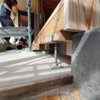 基礎立ち上がりコンクリート打設と天端セルフレベリング材の敷設。大雨予報の日程を避け、快晴の下打設できました。移動のため運転している車内ではだいぶ暑くなってくる季節ですが、まだまだ外では涼しいくらい。良い気候の時に作業ができています。