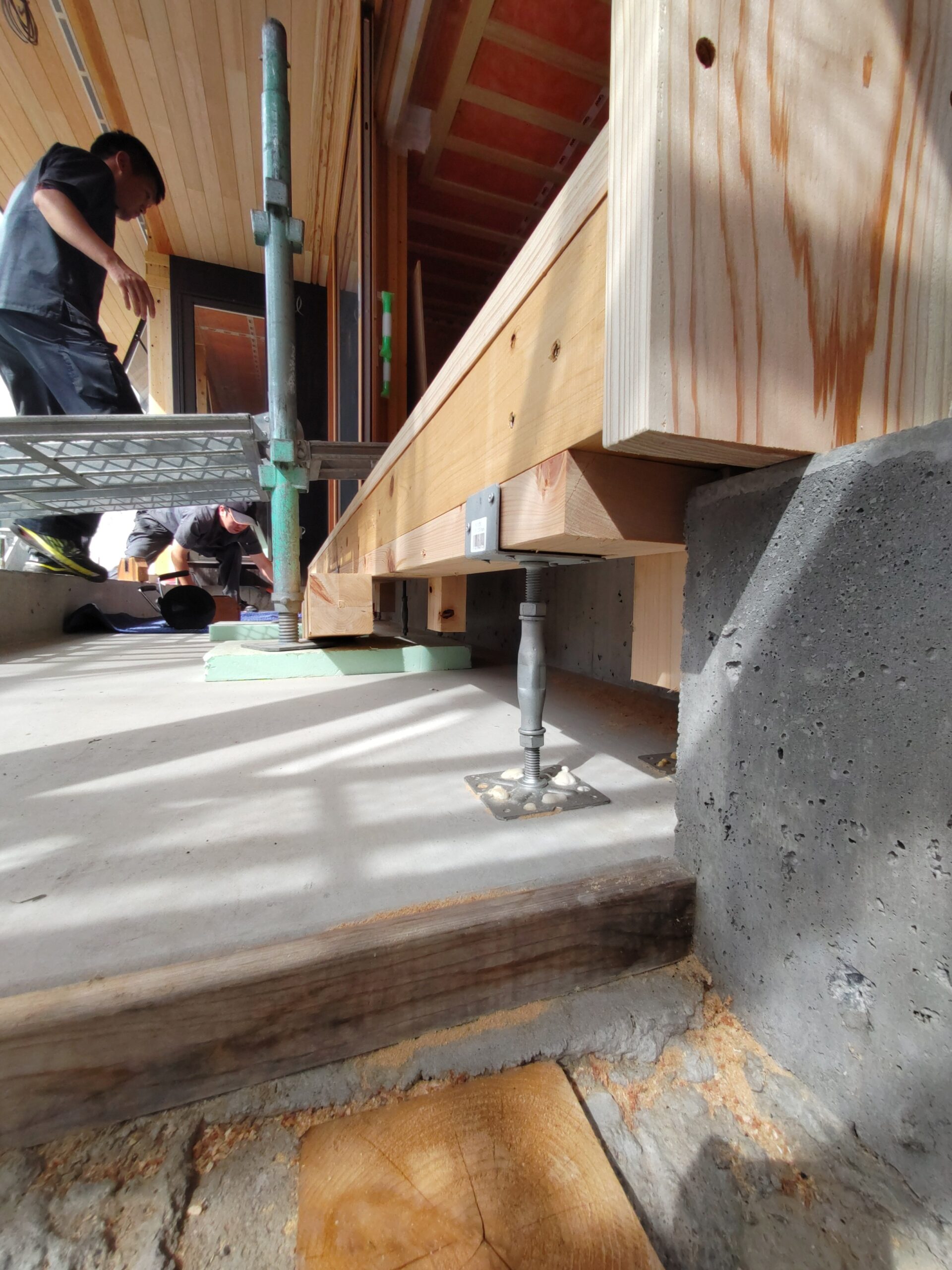土台伏せ工事が始まりました。今回は床下の配管工事は土台伏せと合判で行っています。後に床を伏せてから作業するというのは極めて困難なため今回の工程となりました。